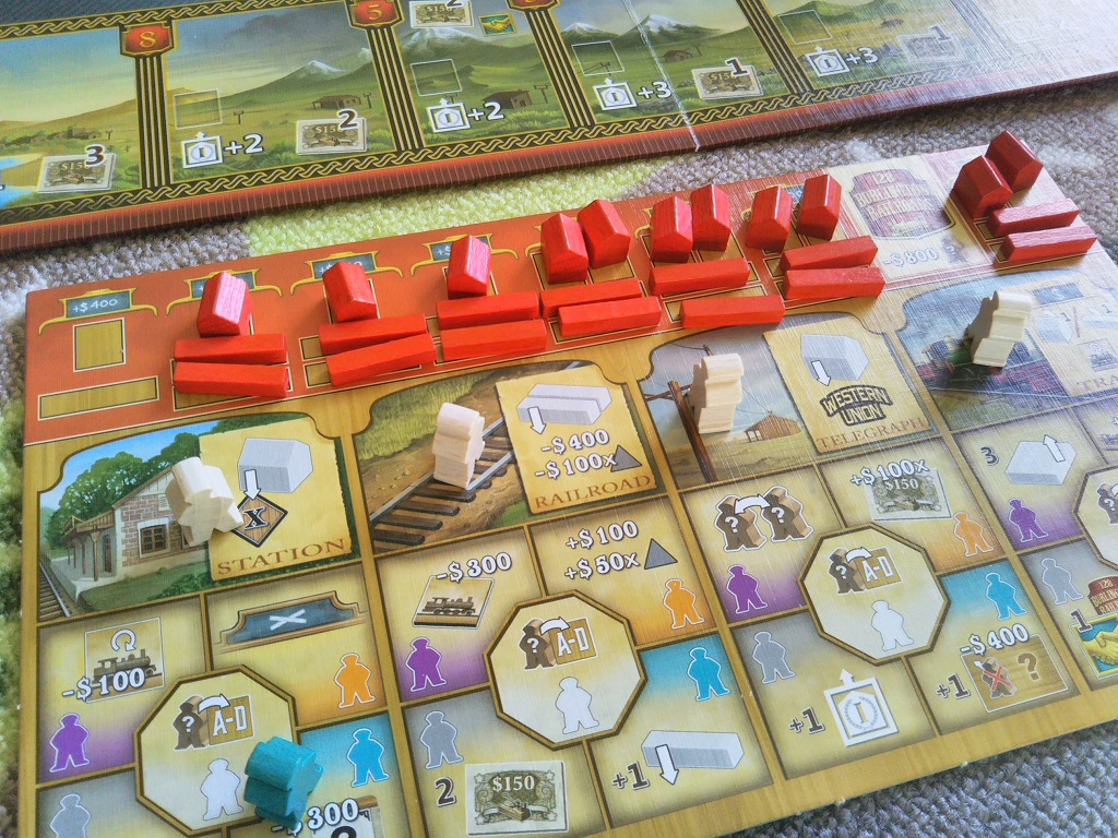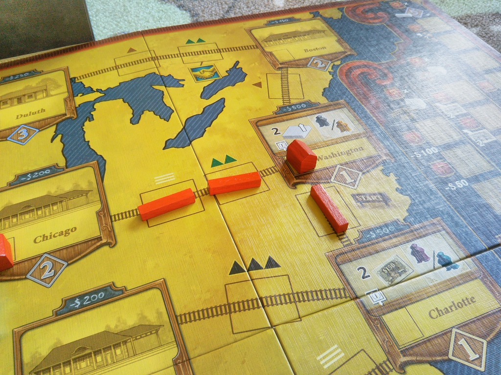 駅や電信施設を建てるとき、早い者勝ちではなく同じ場所に全員が建てられるのですが、一番に建てた人だけがもらえるボーナスが存在します。ただ、インタラクションは薄めのゲームで、人に邪魔されることなくゲームをしたい人におすすめですね。