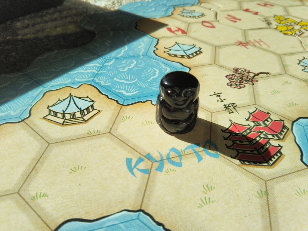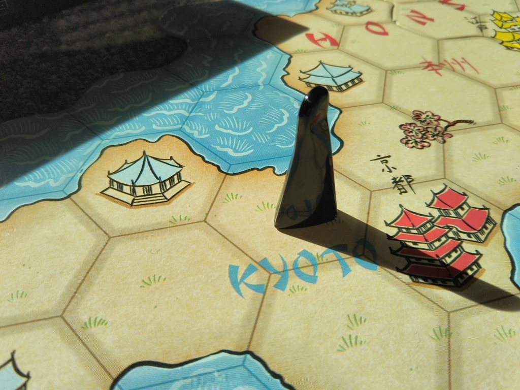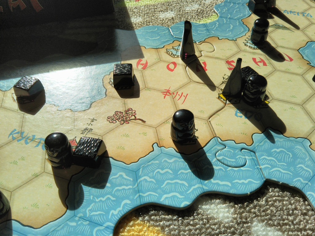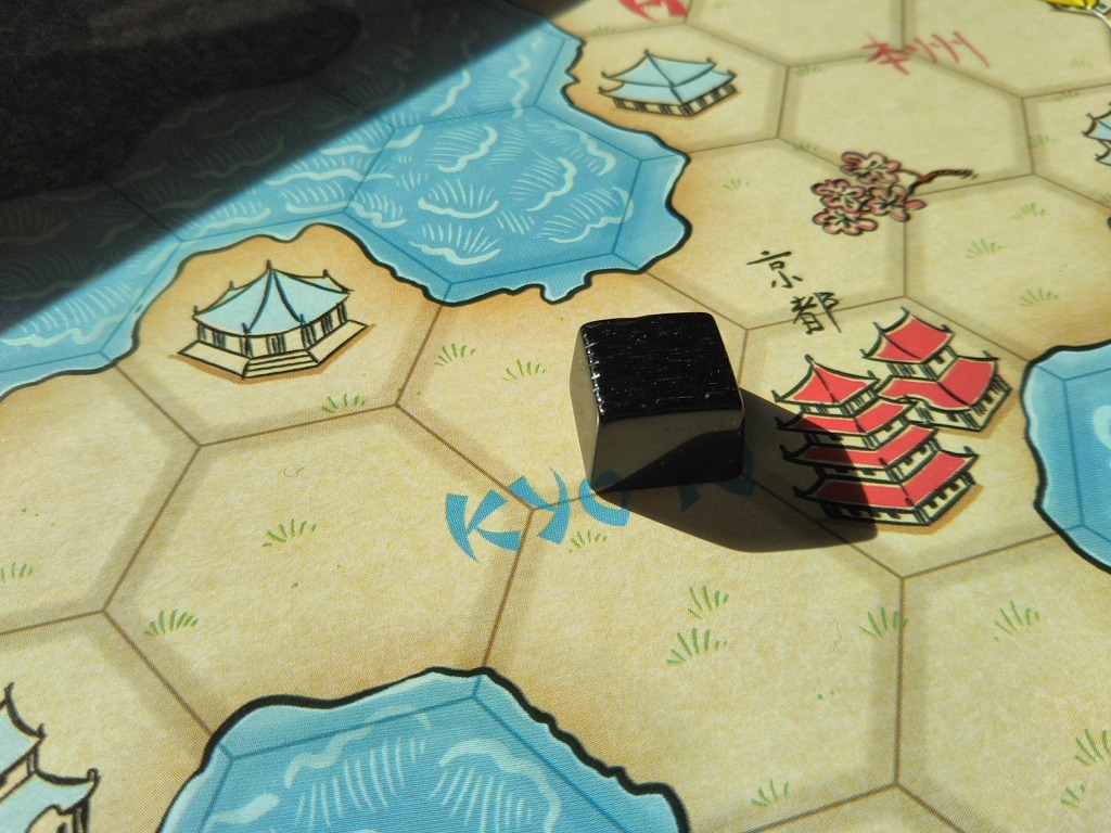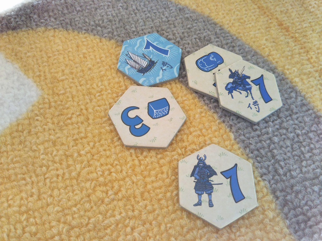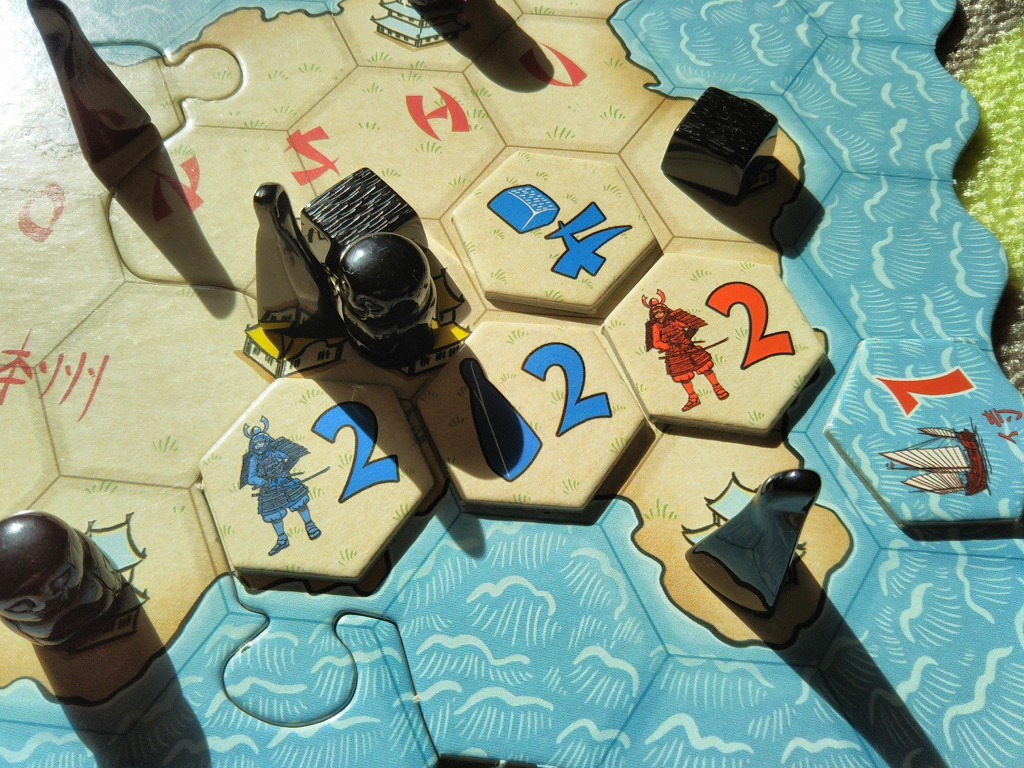 単純に、タイルの絵と数字をみて、駒への影響力を計算すればOK。侍と船のタイルは、すべての駒に影響力を及ぼすものと考えます。