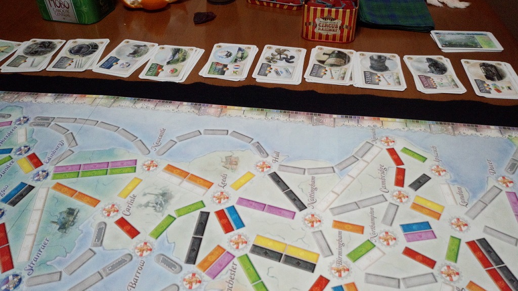 チケライの最新拡張が評判いいので、購入してプレイしました。今までの拡張と違って、列車カード一式が入っているので値段はお高め。イギリスマップはSLカードの比率が違う、拡張独自のカードセットを使います。
