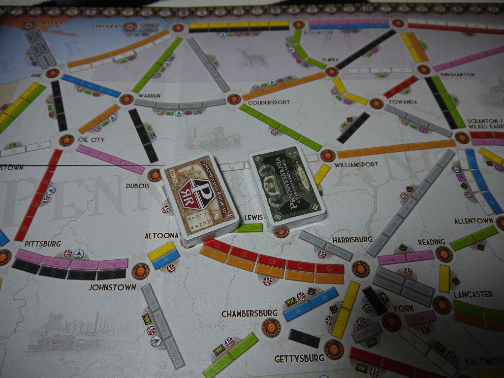 裏面のペンシルバニアマップは株券が登場ということで、ユニオンパシフィックのような拡張になるのか!?と思ったのですが、カードを集めた枚数に応じて最後に得点と、株価の変動要素がなくシンプルなルールになっています。 株というか、「ボーナスカード集め」ぐらいのインストがいいかもしれません。 株ゲーって嫌いな人がいるので。