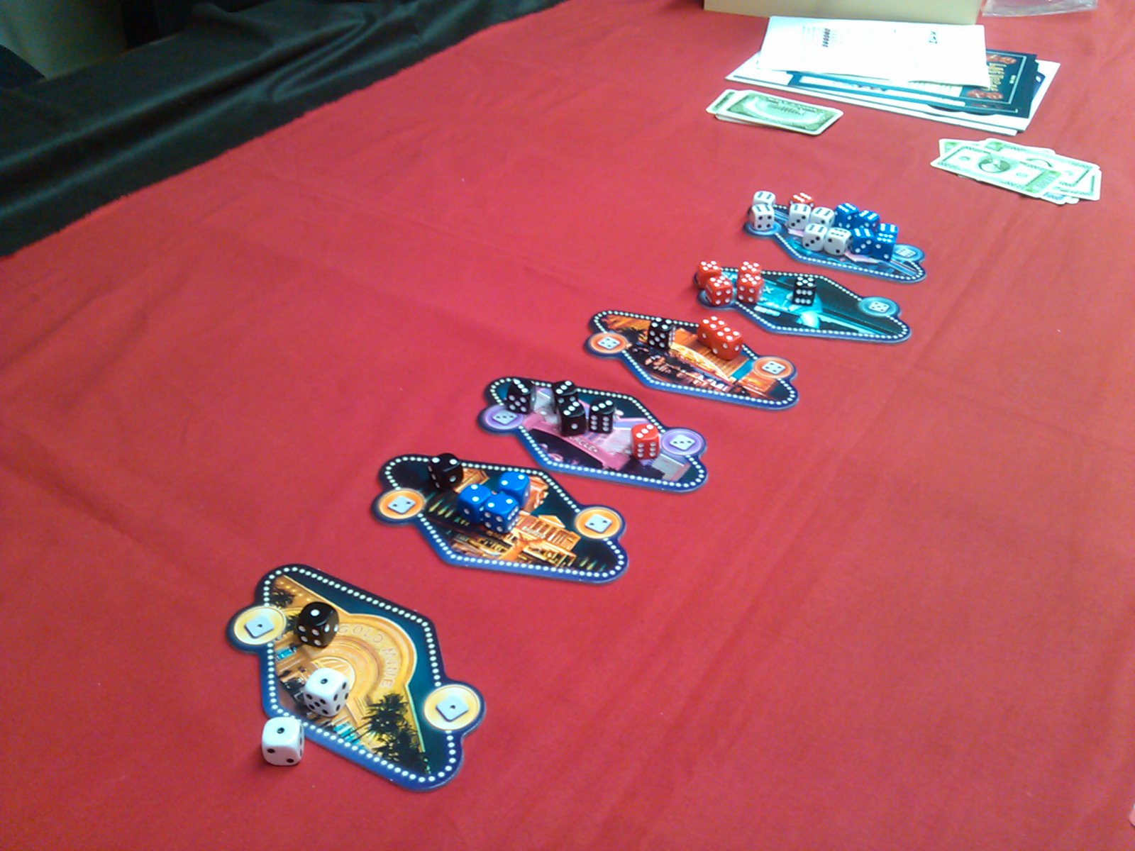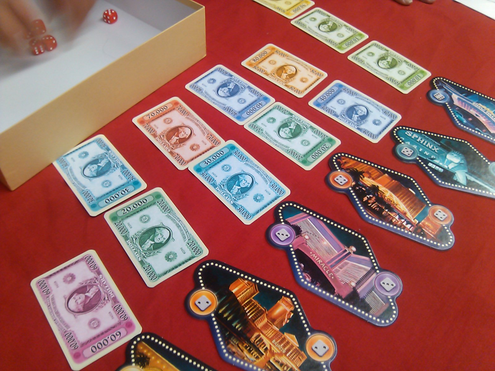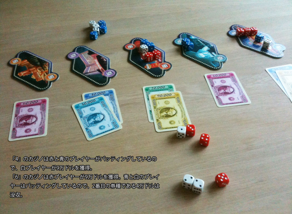この時、お金カードが複数置かれているカジノがあったら、一番多くサイコロを置いたプレイヤーに一番高い券種が与えられ、2位のプレイヤーには2番めの券種が・・・ となる。