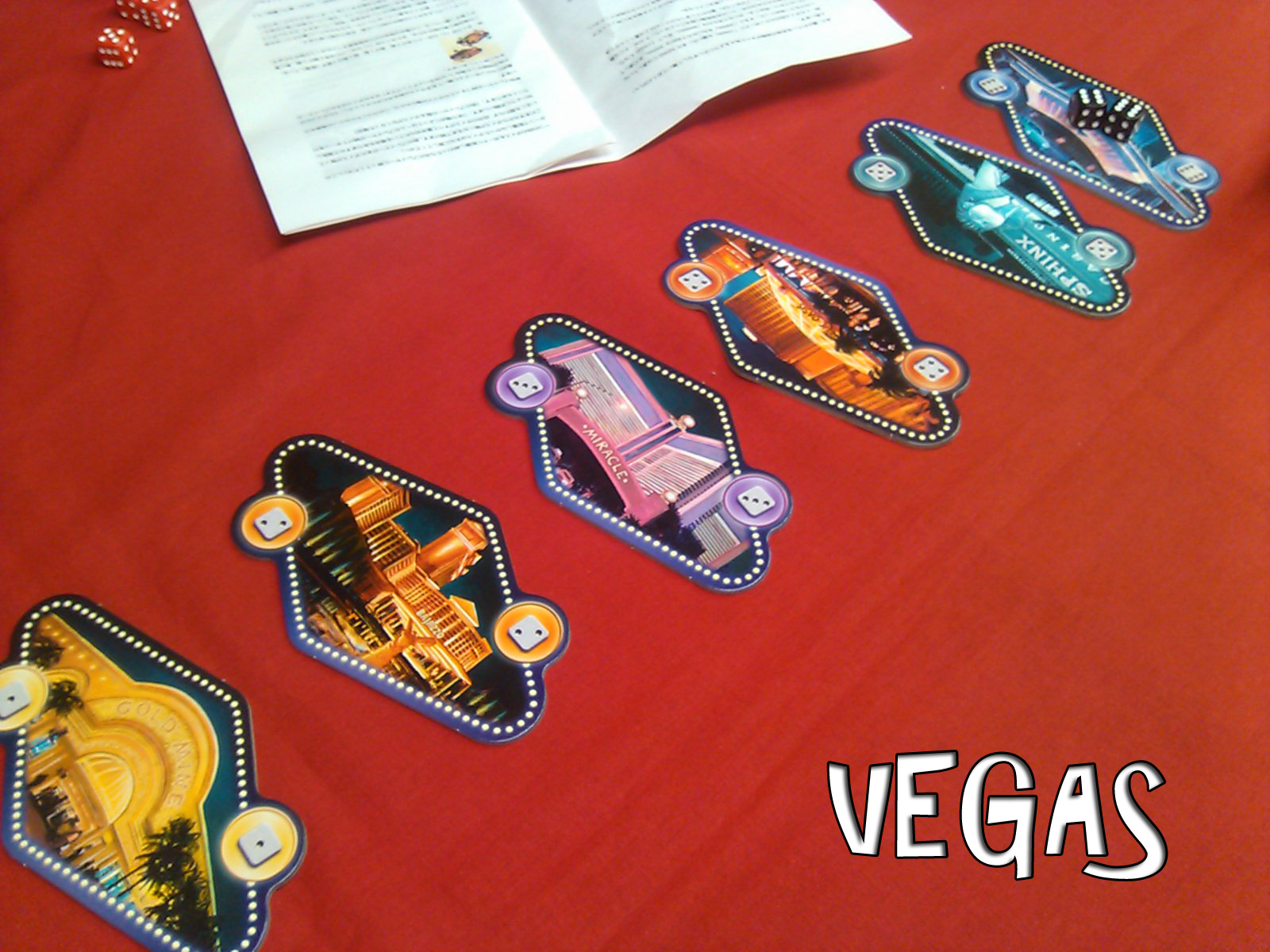 まずは上の写真のように、6枚のカジノタイルをテーブルに並べる。実在のカジノをもじった名前がホテルに付いていて、ラスベガスを知っている人ならニヤリ。私が旅行で泊まったホテルも有るなぁ。