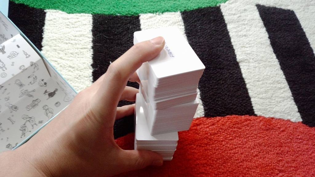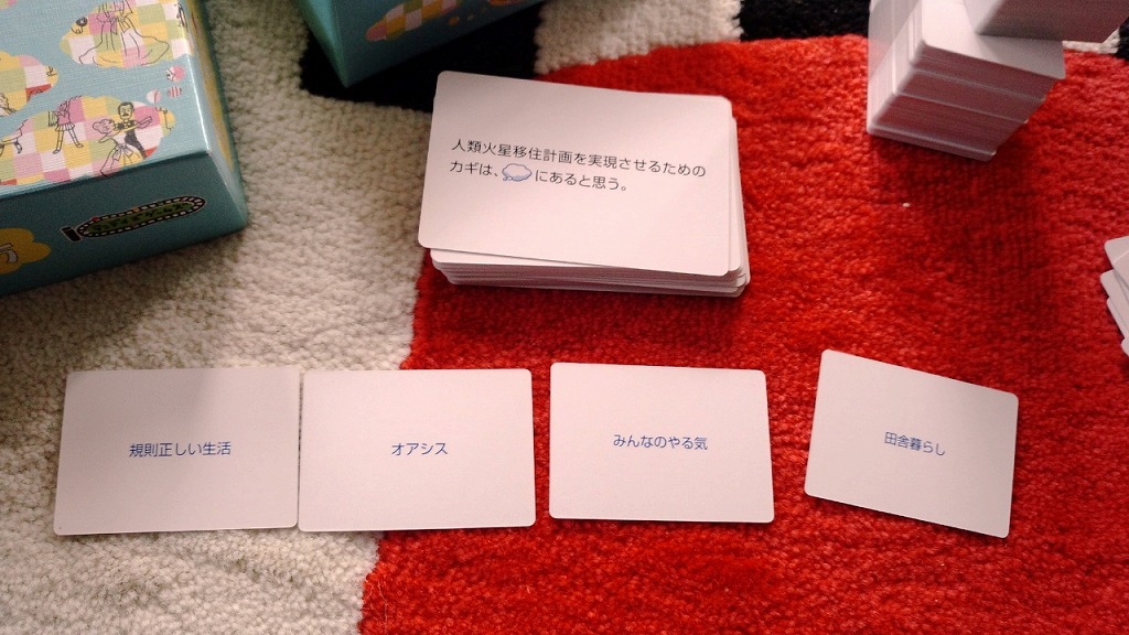 親がカードを選ぶため、その人が好きそうな言葉(シュールな笑いが好きなのか・下ネタ系か・・・)を出すのが面白いのです。ゲームを進めていくと、その人の性格がよくわかります。
