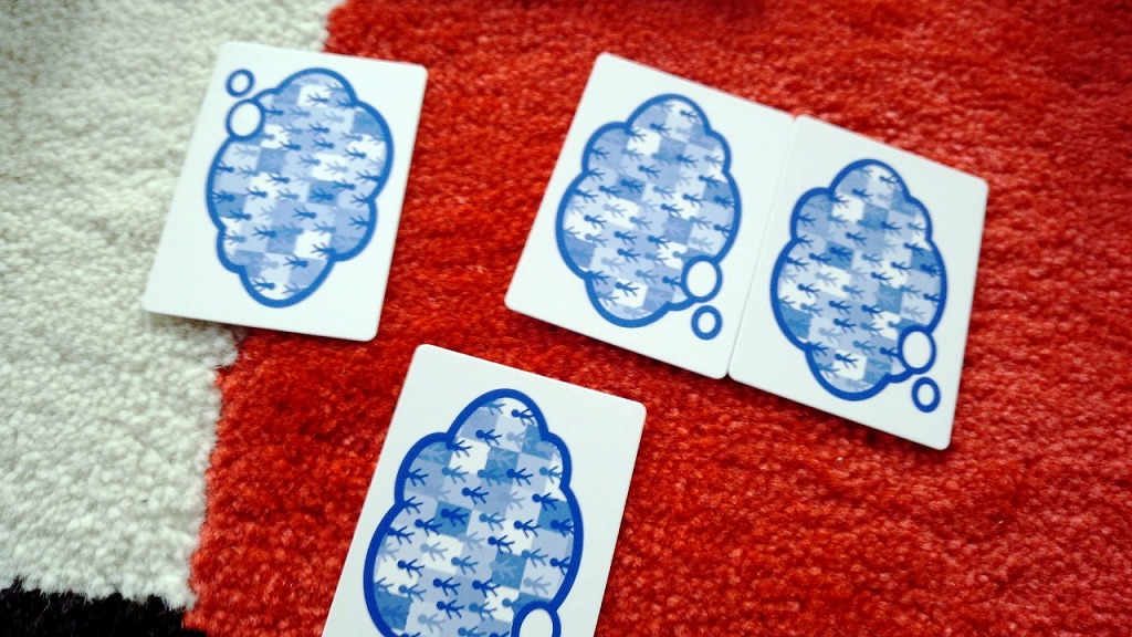 親以外のプレイヤーがカードを裏向きで出し、よーく混ぜます。このとき、言葉カードの山札から一枚、ランダムで引いて混ぜます。これは「神様の声」です。