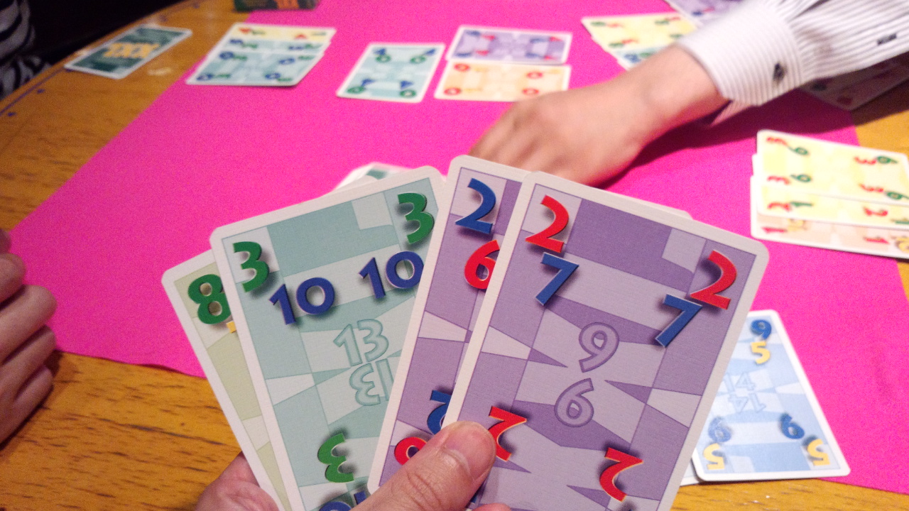 カードには3つの数字が書かれているが、真ん中の数字は両端の数字の合計だ。点数計算に使うだけ。
