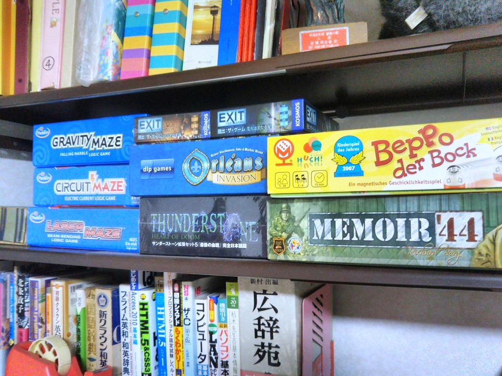 あと、ピアノの上に作り付けの棚があり、ここに一部避難させてます。グラビティメイズとか、脱出:ザ・ゲーム とか ボドゲなのか?? というような作品くくり。