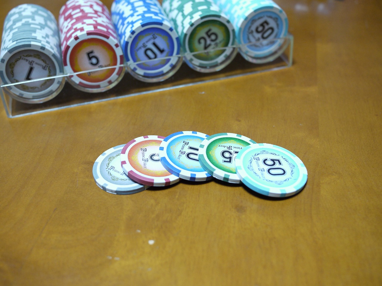 先日も紹介したプライムポーカーチップ。ゲームに付属の勝利点チップがしょぼくて萎えるときに。