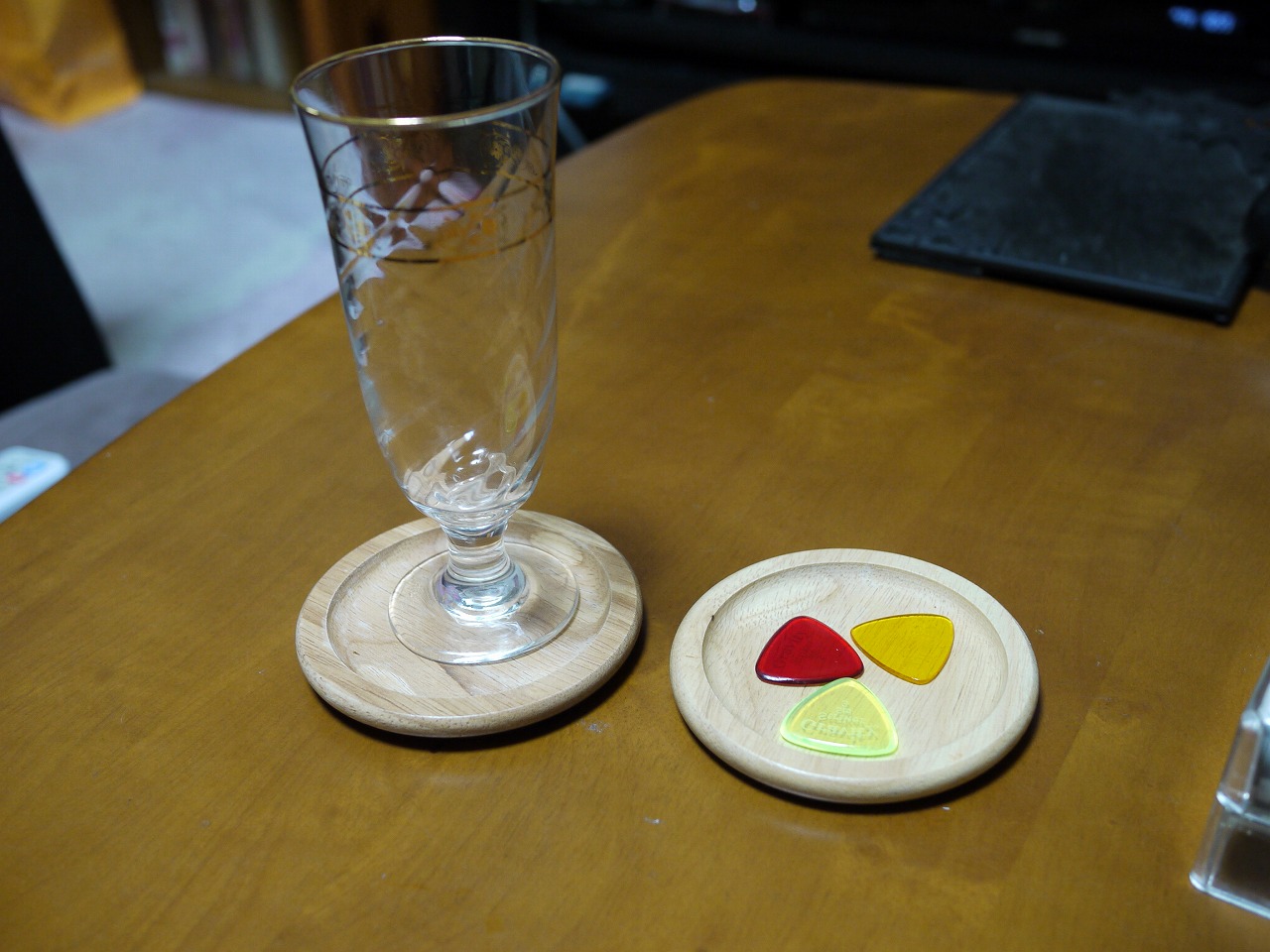 資源駒などを置く木のトレイ。でも思ったより浅く、使いづらかったので普通にコースターとして使ってるww