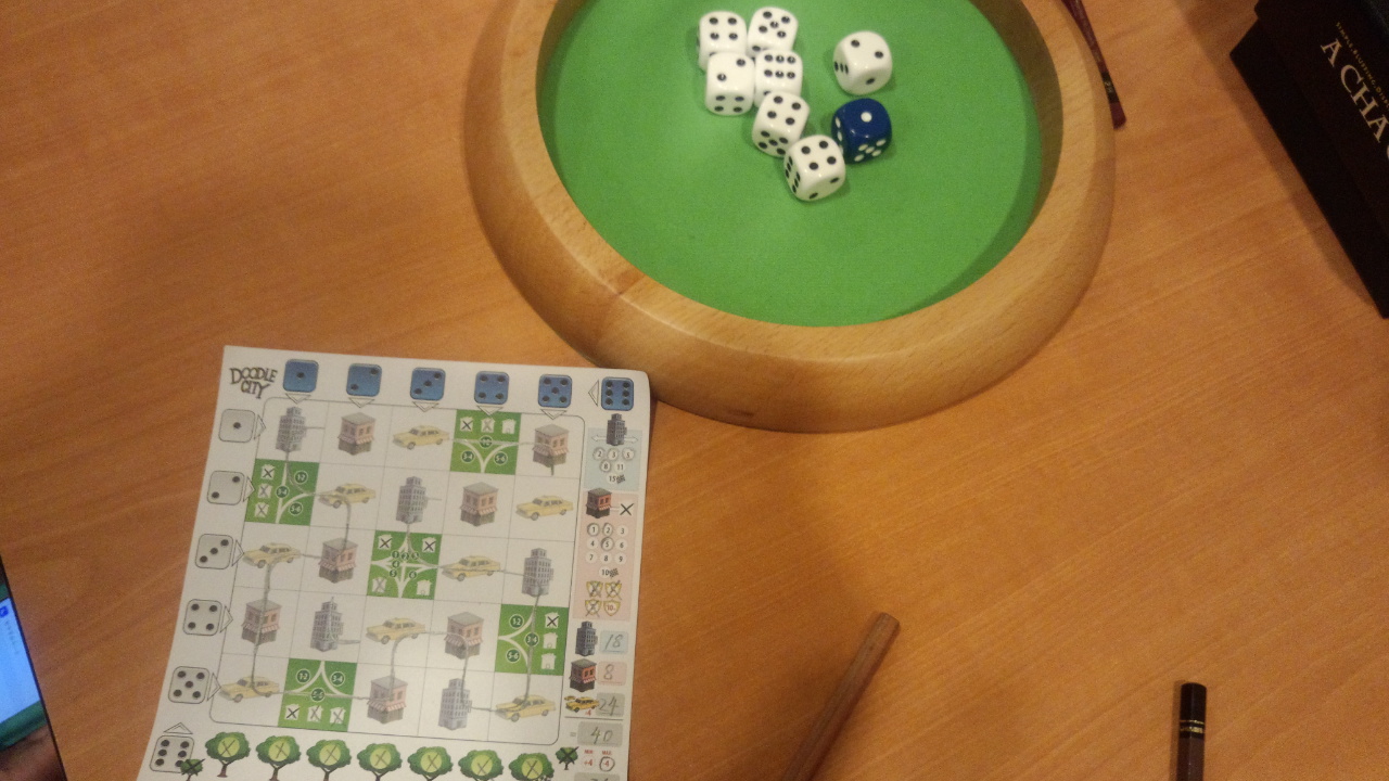 【ドゥードゥルシティ ★★★】ダイスを振ると縦軸と横軸を指定され、描けるところに道路を引いていく。どれだけシンボルを通ったかで得点。街づくりというかルートづくり。