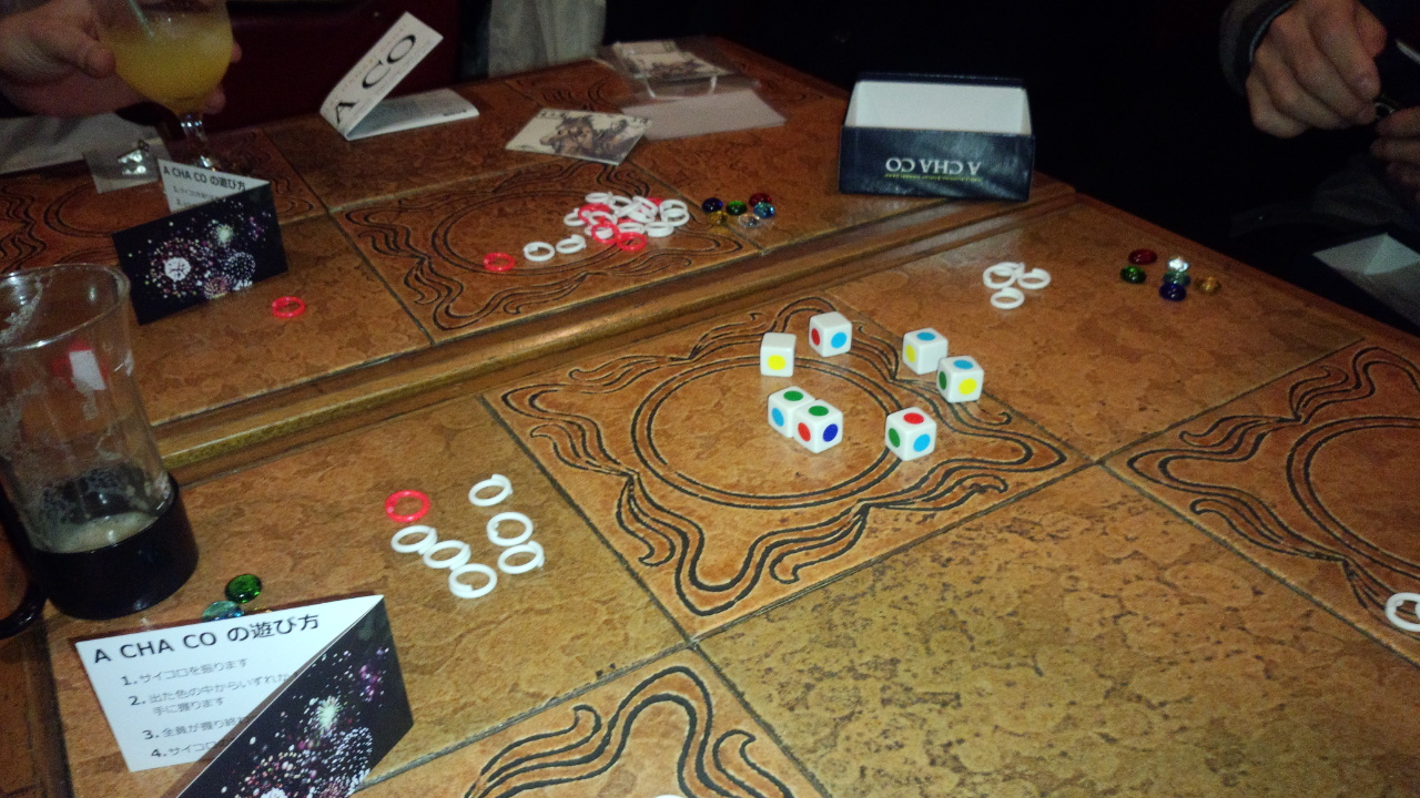 【アチャコ ★★★】カラーダイスをバラっと振って、好きな色の駒一つを握りこむ。ぱっと開いてその色の目の数と握りこんだ人数が一致すれば、数の分だけ得点。多人数でないと楽しめないが結構良い。