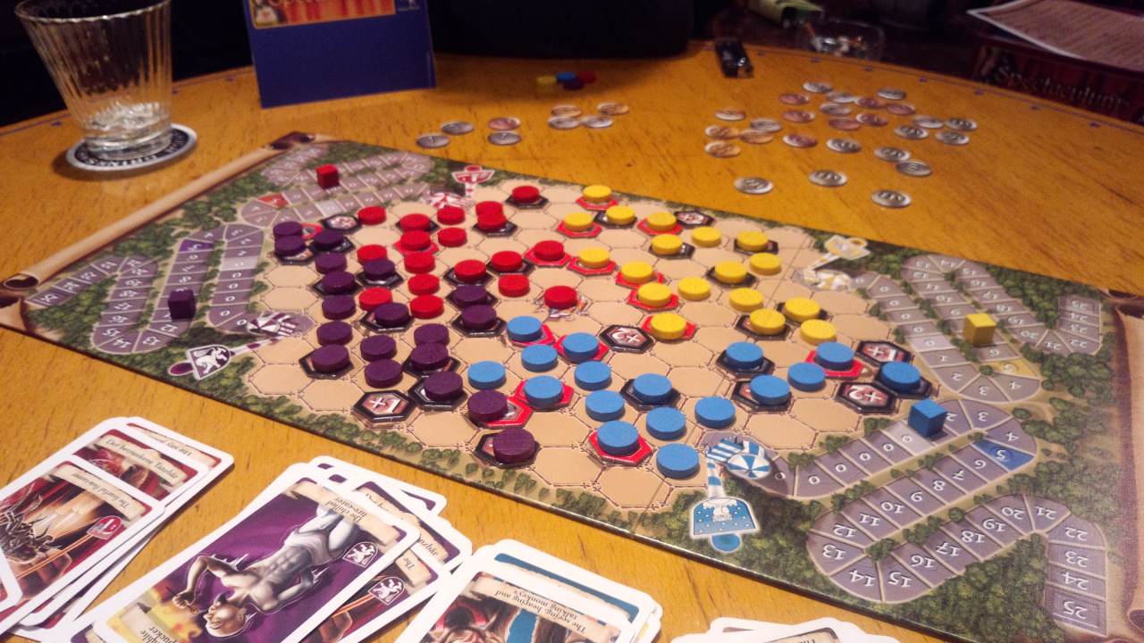 砂時計をやりたいアクションに配置し、砂が落ちきったらそのアクションを実行できる。砂時計は各自二つ持っているので、混乱必死・・・を楽しむゲームだが、正直わけわからんww楽しめるとこまで行くには習熟を要する。