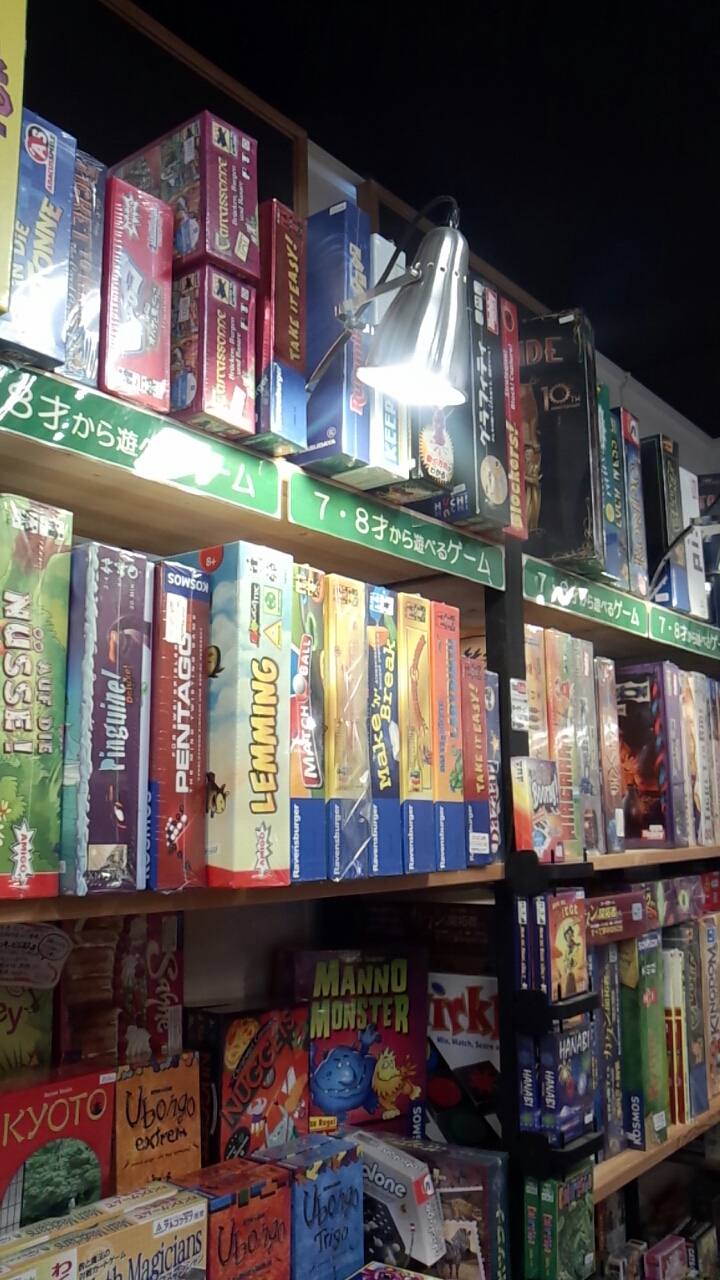 ひとしきり見た後、店長さんとお話させていただいたのですが、カウンターの後ろにずらりとゲーム会用のゲームが並んでいて、よくゲームイベントをやっているそう。ゲームの陳列も左から右に難しく、大人向けになるように並べているそうで。