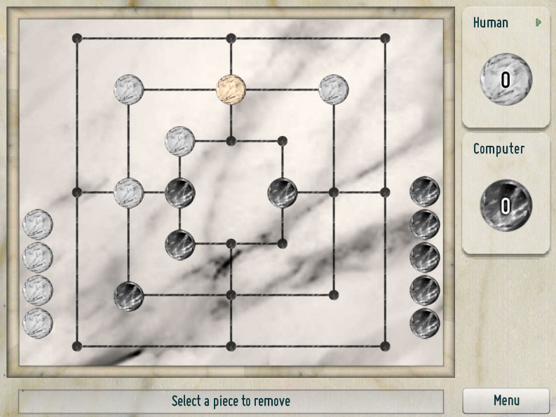 直線上に自分の石が3つ並ぶと、相手の石を盤面から取り除くことができる。取り除いた石は再利用不可。