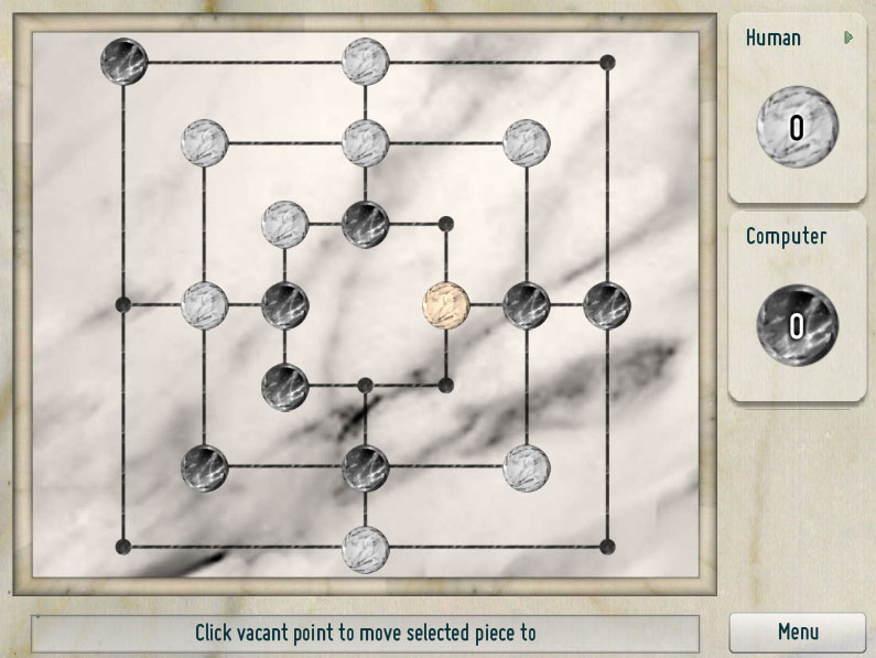 後半は空いている交点に、自分の石を動かすことができる。ここでも3つ一直線に並べたら相手の石をとれる。