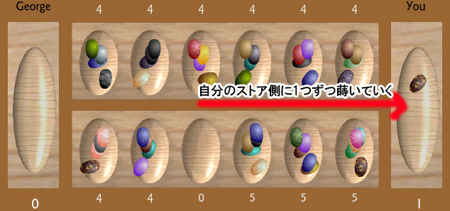 上の画像では、「左から3番め」の穴を選んでみた。反時計回りに順番に石を蒔いていって、自陣のストアに1つ石が入る。これで1点。