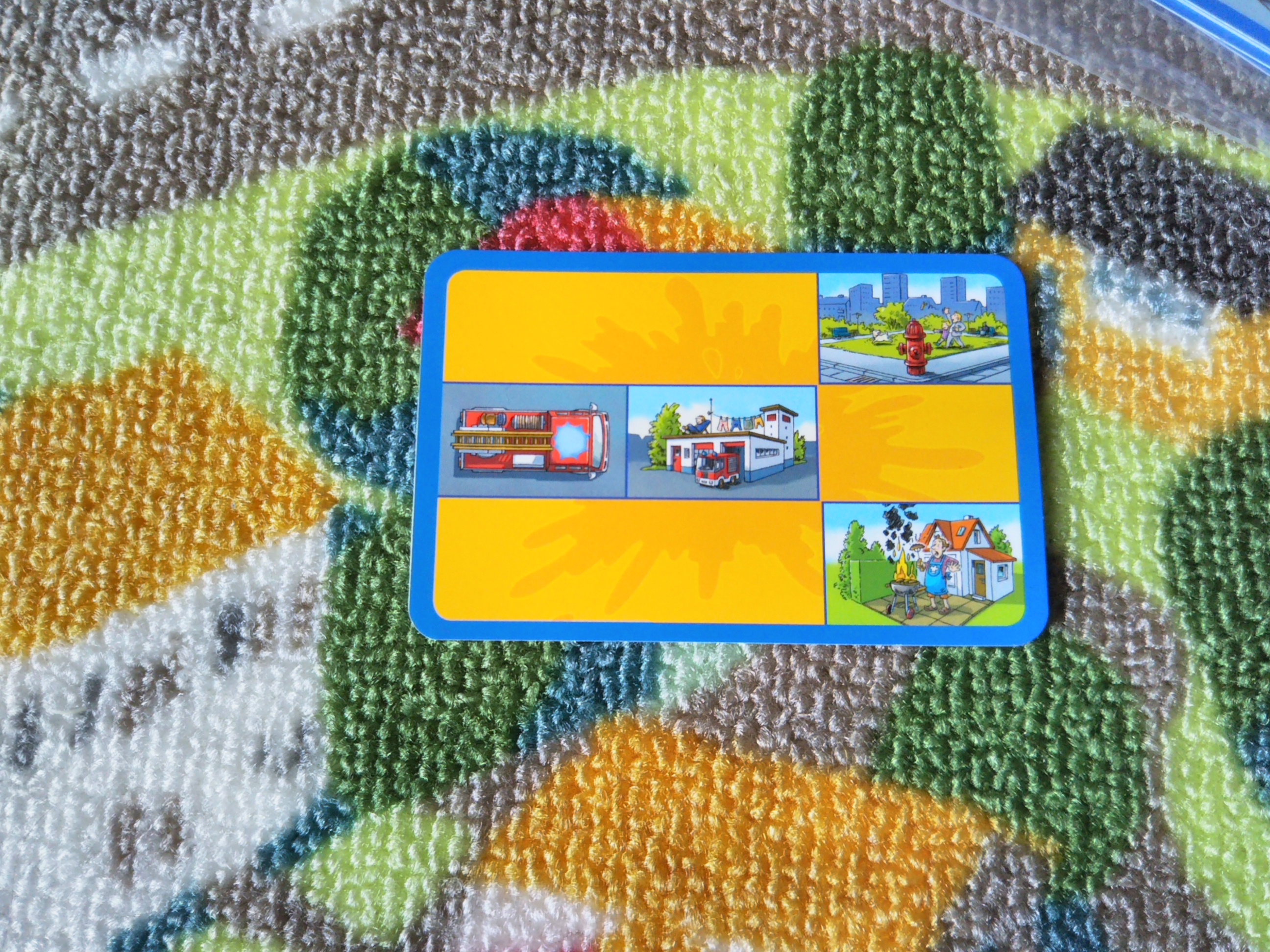 一枚、火災現場のカードをめくると、今回の配置が書いてあるので、この通りに火災現場や消火栓、消防署のカードを並べます。