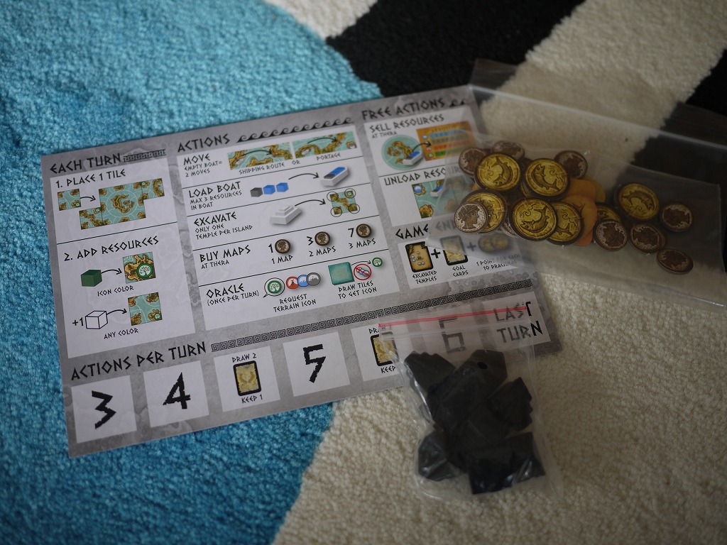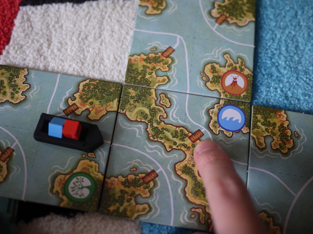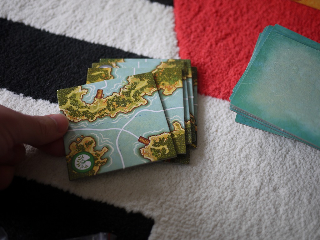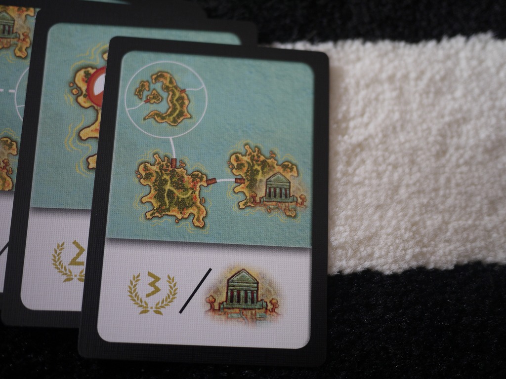 やや気になるのが、目的カードの達成条件にわかりづらいものがあること。(本島から陸路を2つ経由した先にある神殿を発見、とか・・・。実際にプレイしてみてください。)