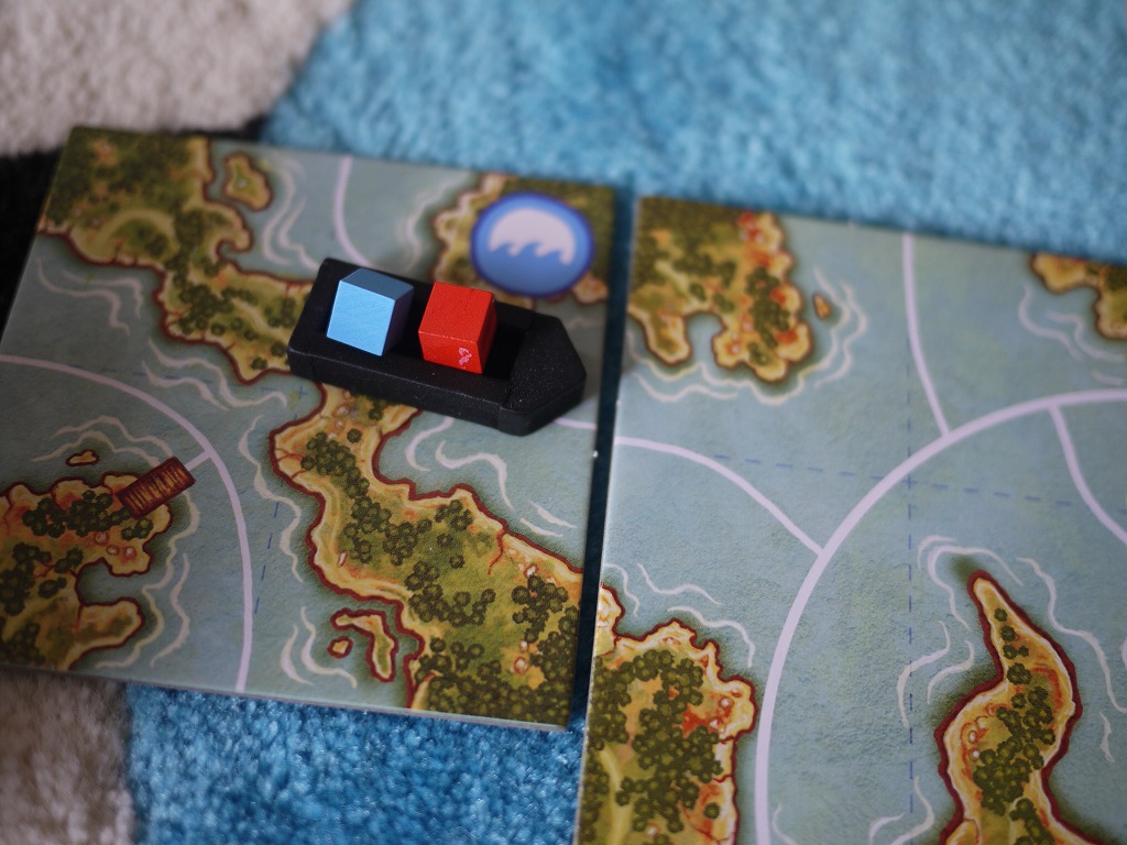 船には3つまで資源を積めるようになっているのですが、一回のアクションで3つまで上げ下ろしを行えます。島から資源を積んだり、別の島におろしたりできますが、売れるのはメインのテーラ島のみ。
