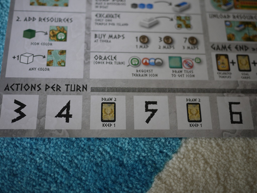 この中から選んで行動が出来ます。最初は3アクションで、神殿を発見すると最大6アクションまで増えます、また、同じアクションを複数回選んでOK。