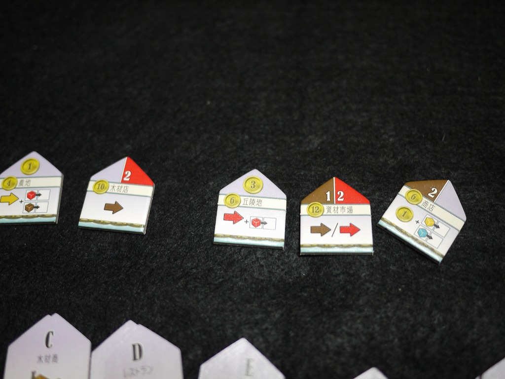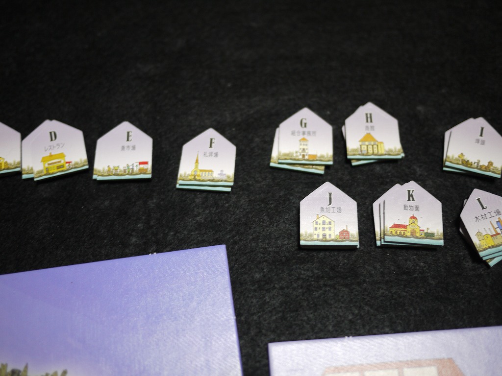 各ラウンドには、指定された建物が場に並びます。(裏側にA~Iのアルファベットが書いてあるので、最初にAの建物が並びます。)