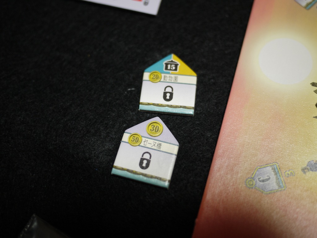 コンポーネントは小さな建物タイルがたくさん。あと個人ボード類で、共通のメインボードは無いタイプです。
