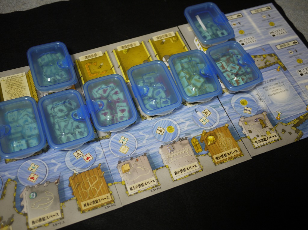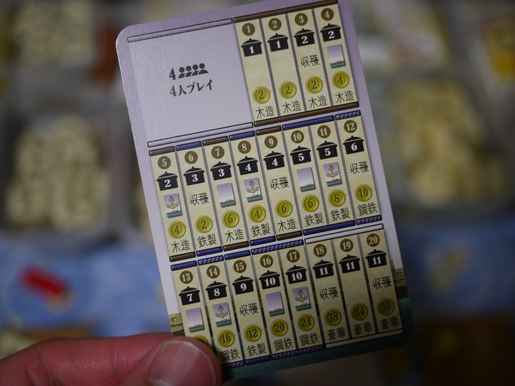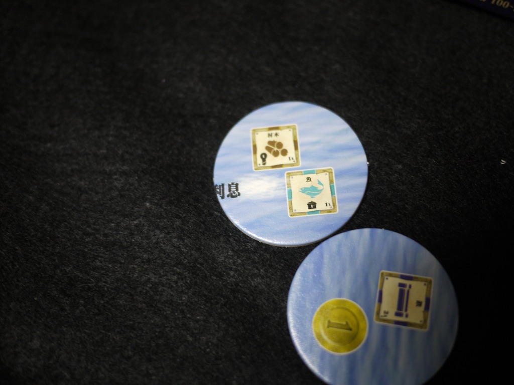 チップに船が到達するたび、描かれている資源を一つずつ補充します。実はこれが相当めんどくさく、プレイ時間を長くさせる原因です。アナログゲームとしてはこれが限界だろうというめんどくささ。iOSのデジタル版は自動処理なので楽です。