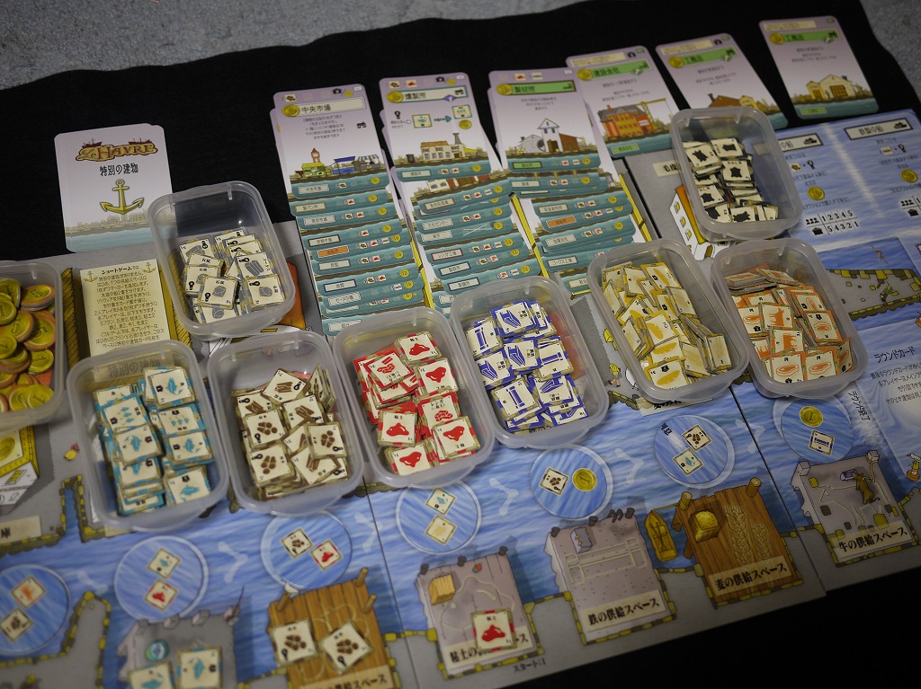 これをボードにセッティングし、やたら複雑な建物カード配置作業をクリアし(人数によってセットアップ方法が違う)