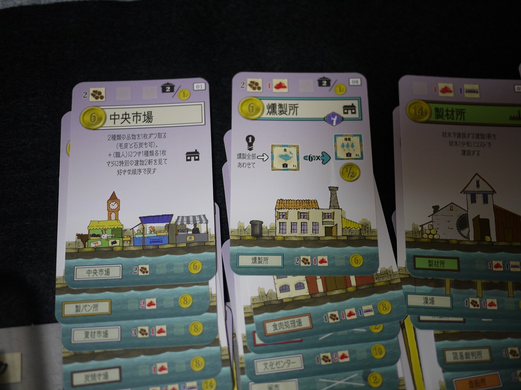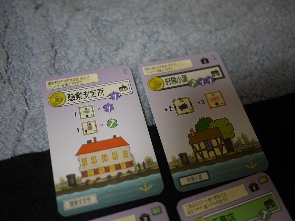 最初はだれもカードを手元に持っていないので、この「共通の建物」を使うことになります。これらは最初から「街に建っている」建物で、右上に書いてあるコストを支払うことで使えます。