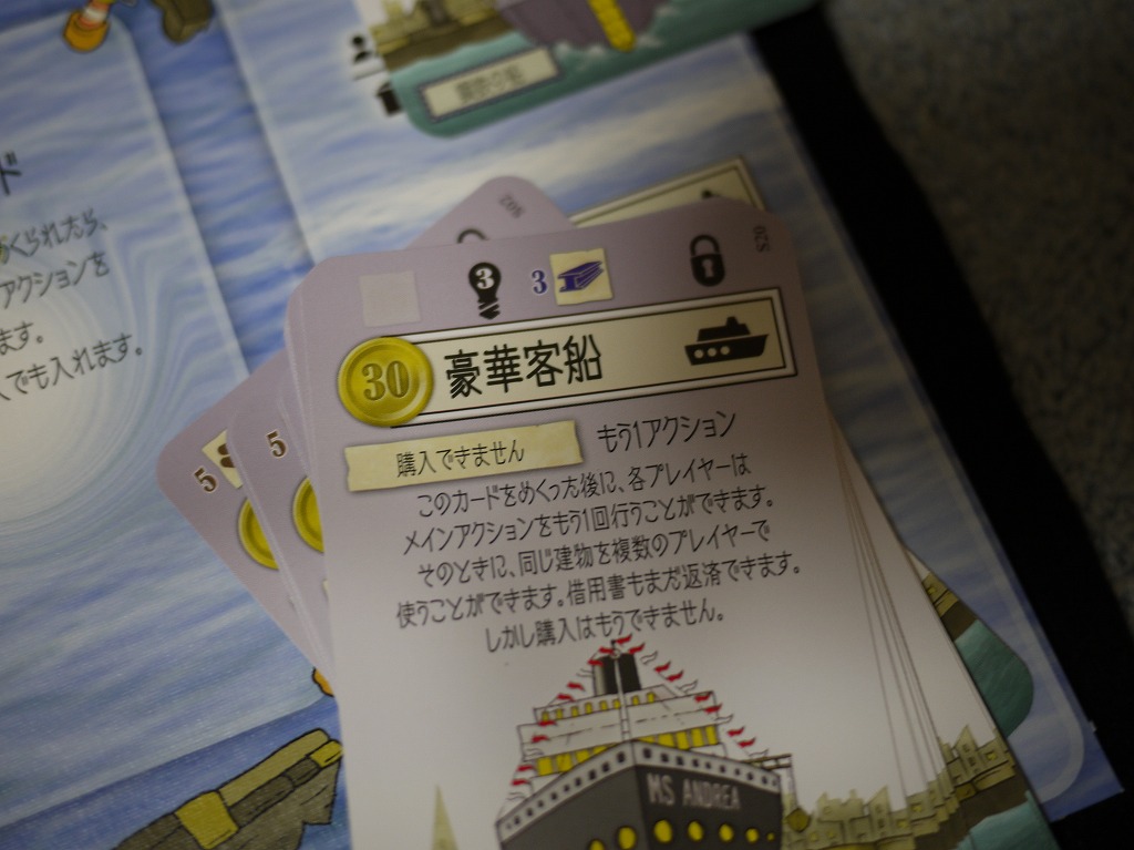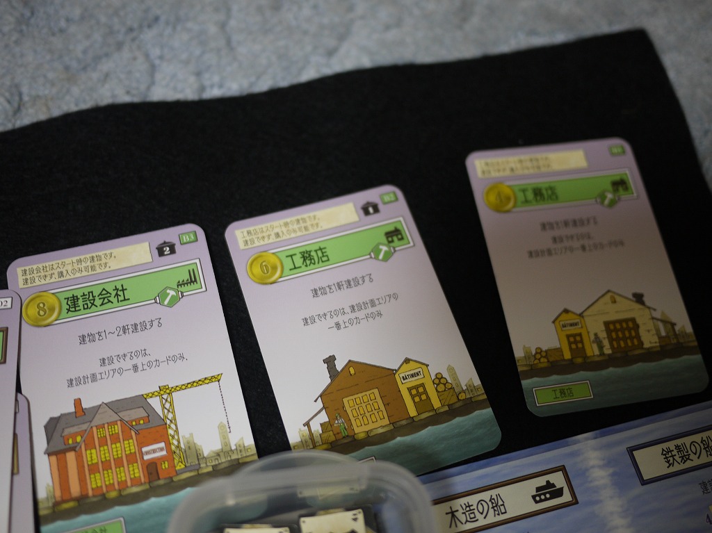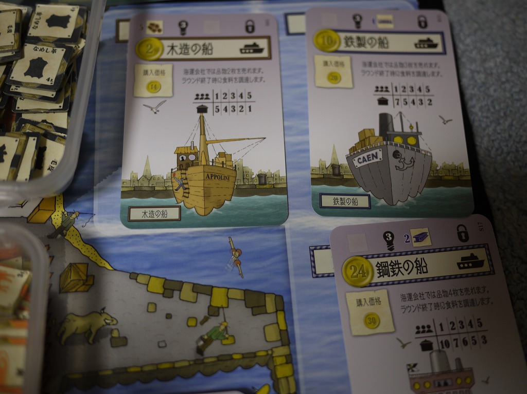 ※ちなみに追加アクションとしてお金で建物を買うことができます。買えるのは「共通のエリア」「建設計画の一番上の建物」「船」で、価格は基本的にこの勝利点と等価。