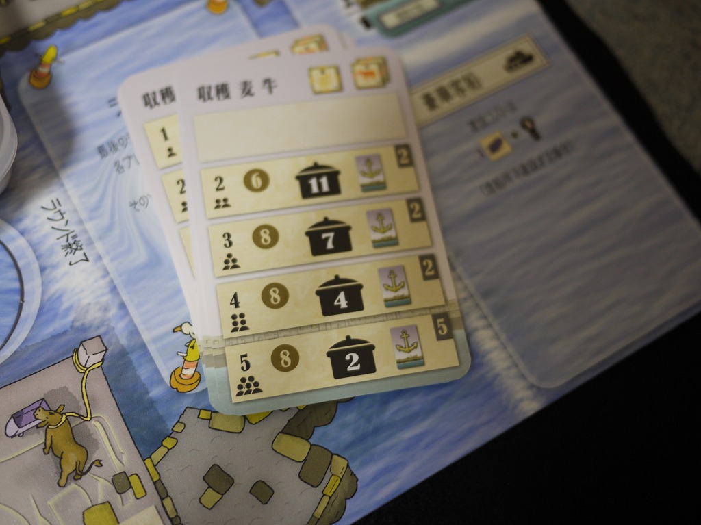 ラウンド終了時には、「収穫」と「建物の建設」処理も行います。収穫は簡単で、ラウンドカードに収穫アイコンが書かれていたら、「牛は2頭以上」「小麦は一個以上」持っていたらそれぞれ一つ獲得できます。この辺はアグリコラと似てますね。
