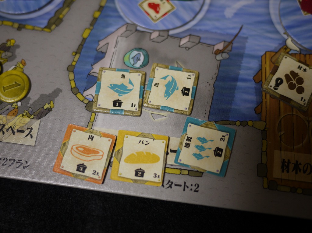 各資源が食料いくつ分に相当するかは、チットに書かれています。魚は1、パンは2、肉は3。