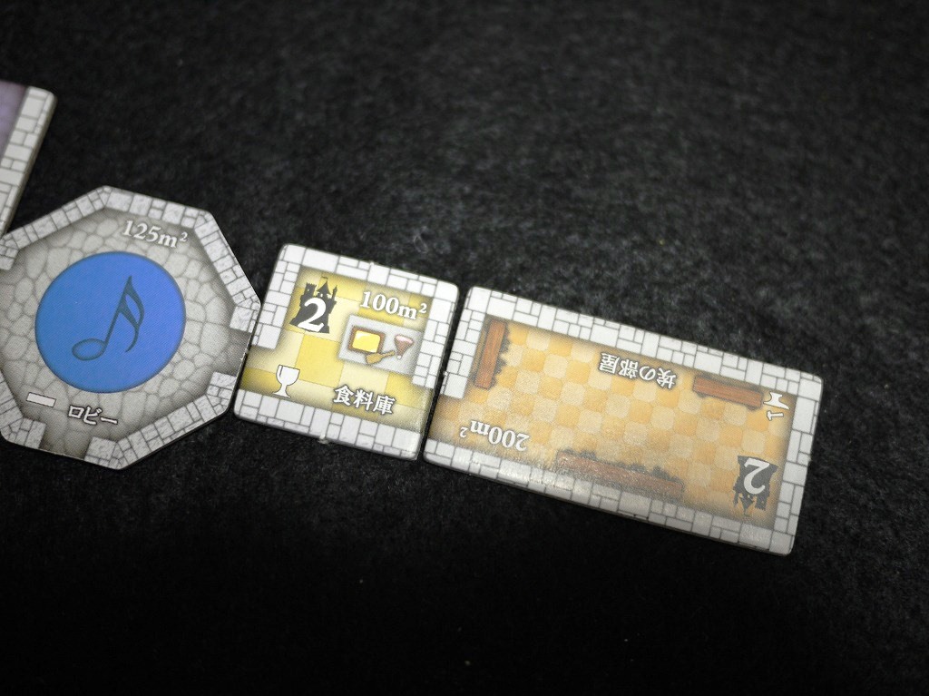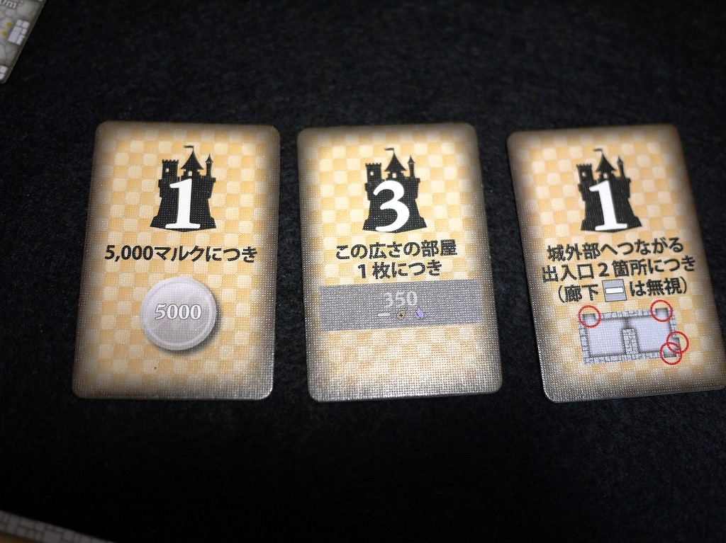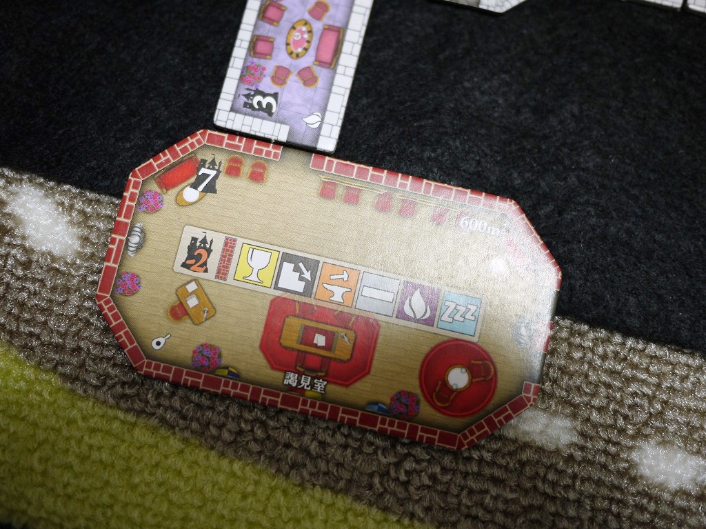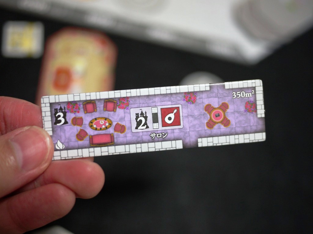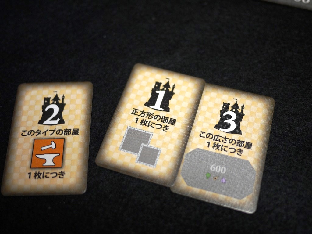 また、タイルの真ん中には特定の条件を満たした時に発生する点数が書かれている。大抵は、「描かれたアイコンの種類の部屋と隣接して建てたら得点」というもの。