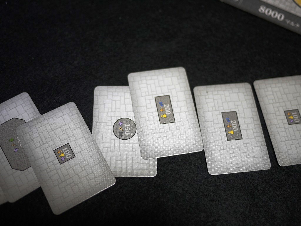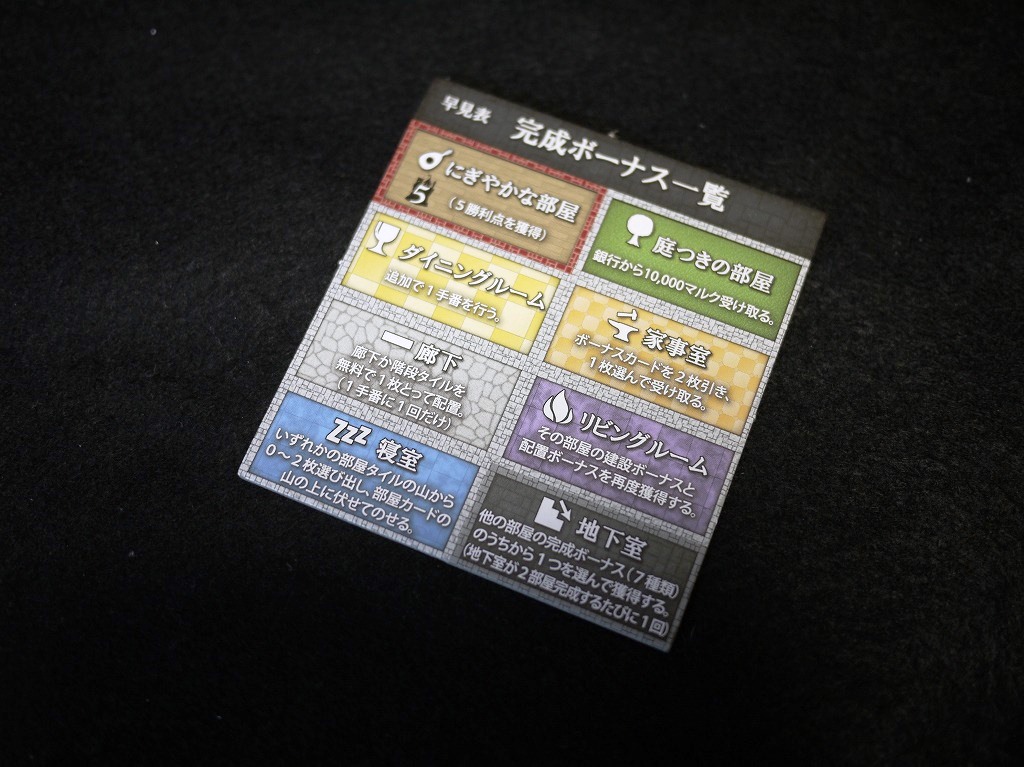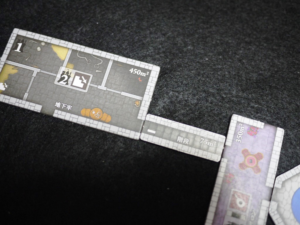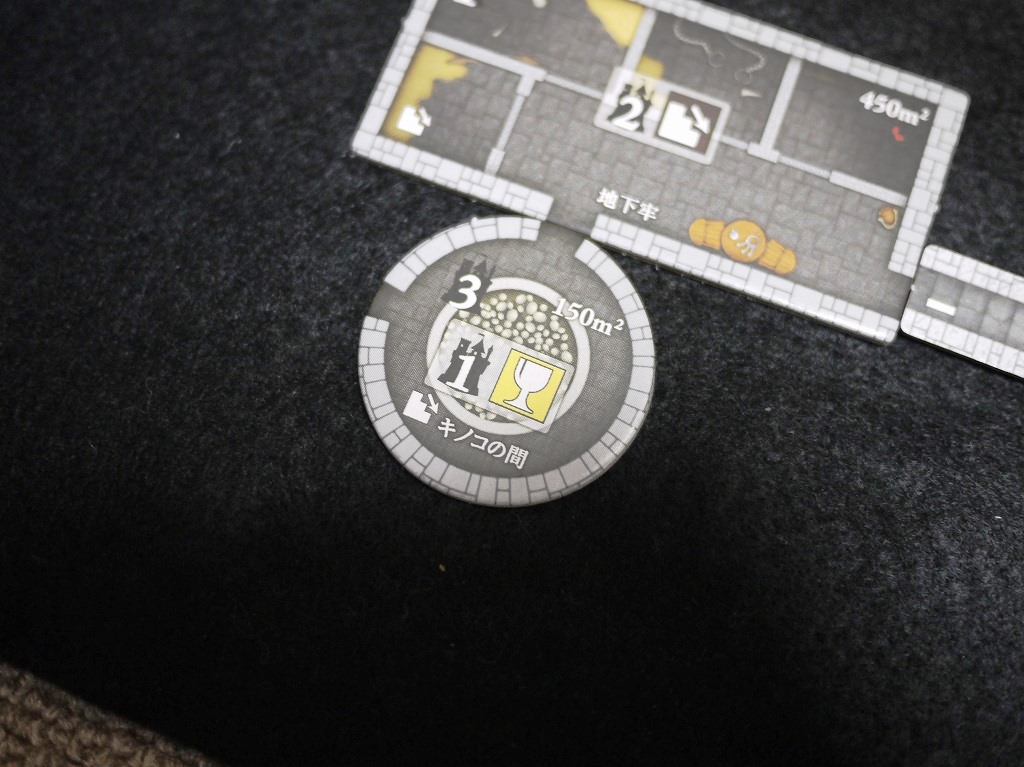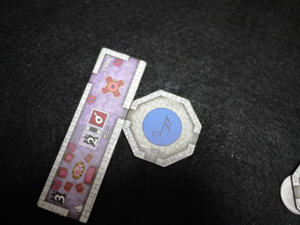 また、タイルの真ん中には特定の条件を満たした時に発生する点数が書かれている。大抵は、「描かれたアイコンの種類の部屋と隣接して建てたら得点」というもの。