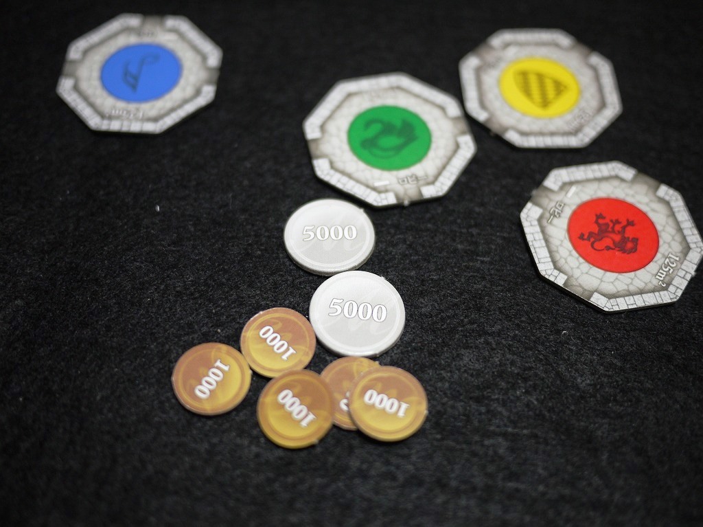 「王の関心」タイルを並べる。4人なら4枚。これは最終得点計算に影響する。