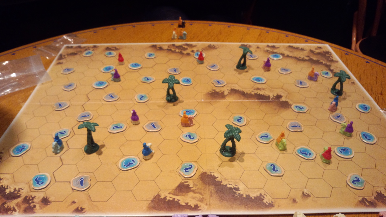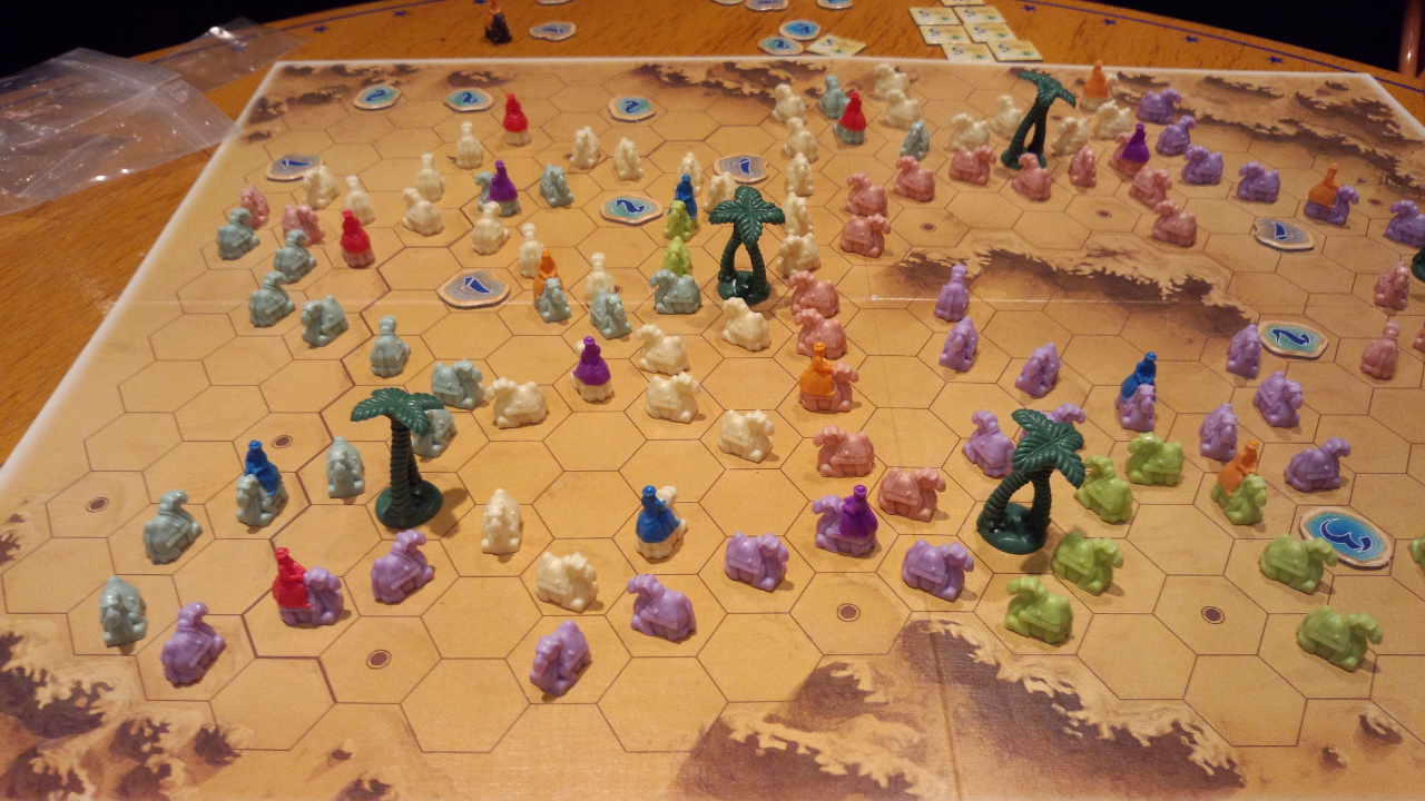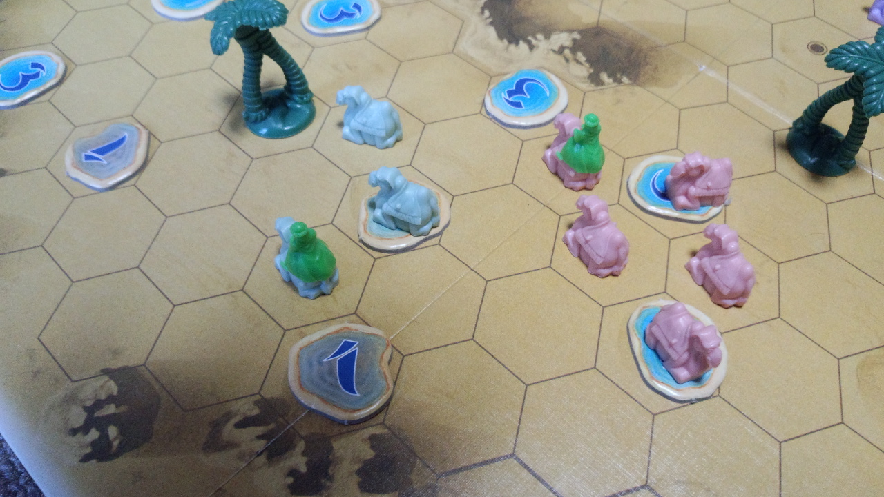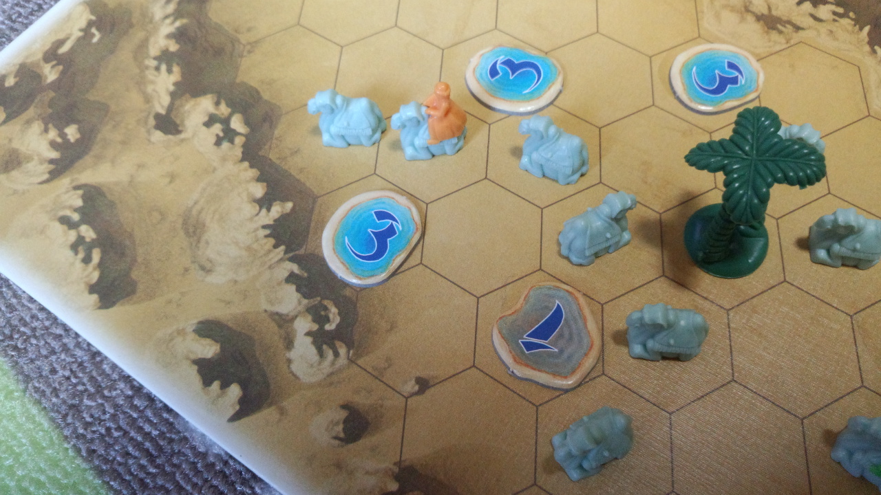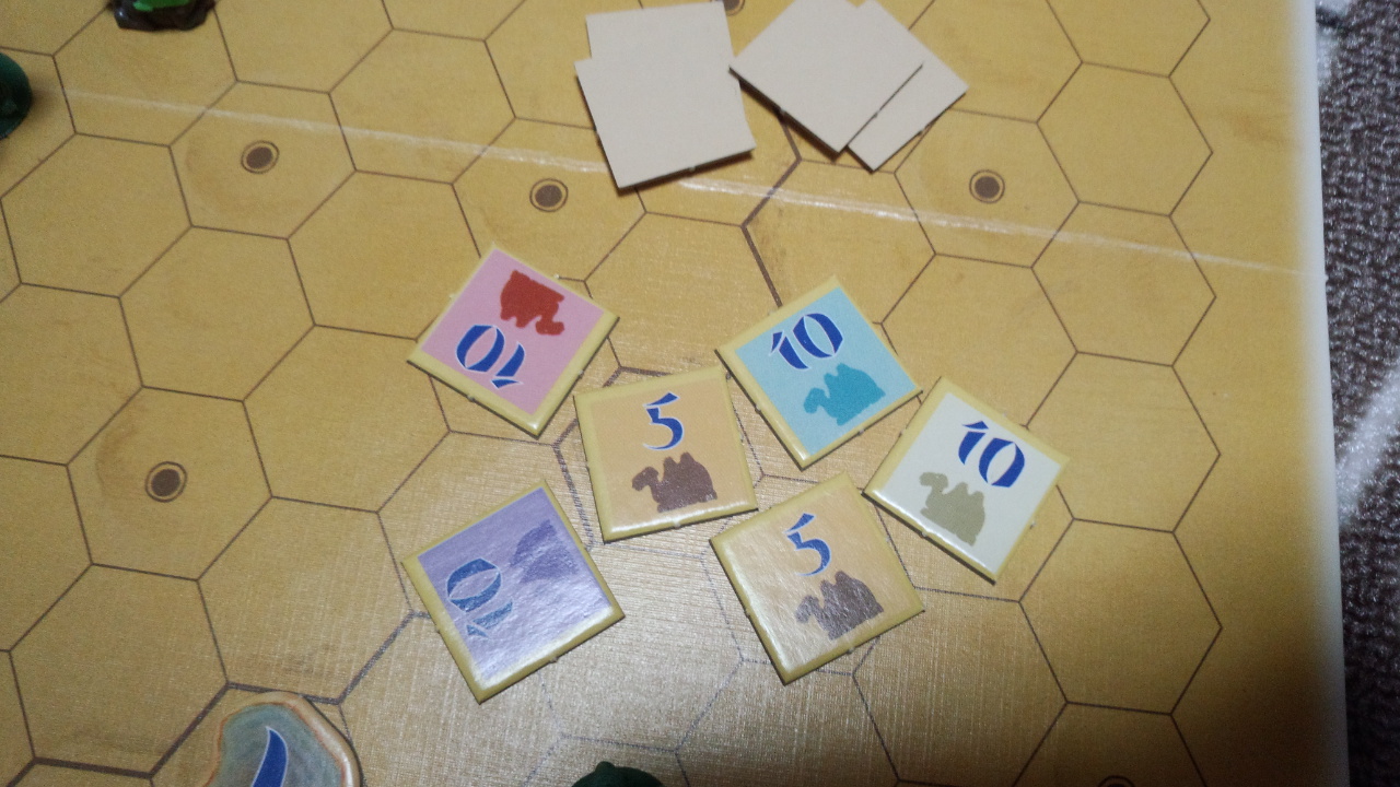 ※部族がひとつ余るので、これは茶色のラクダに載せておく。ゲームには使用しない駒で、単に自分の担当色を表示しておくだけの物だ。