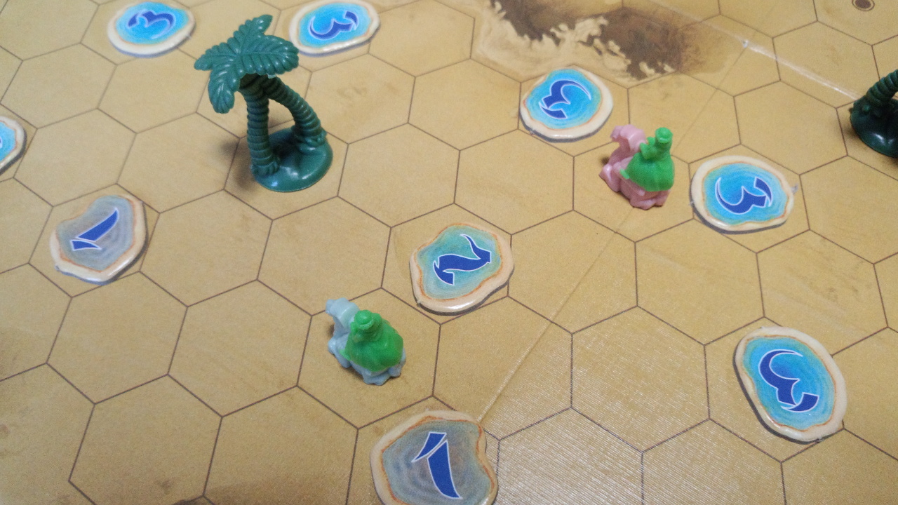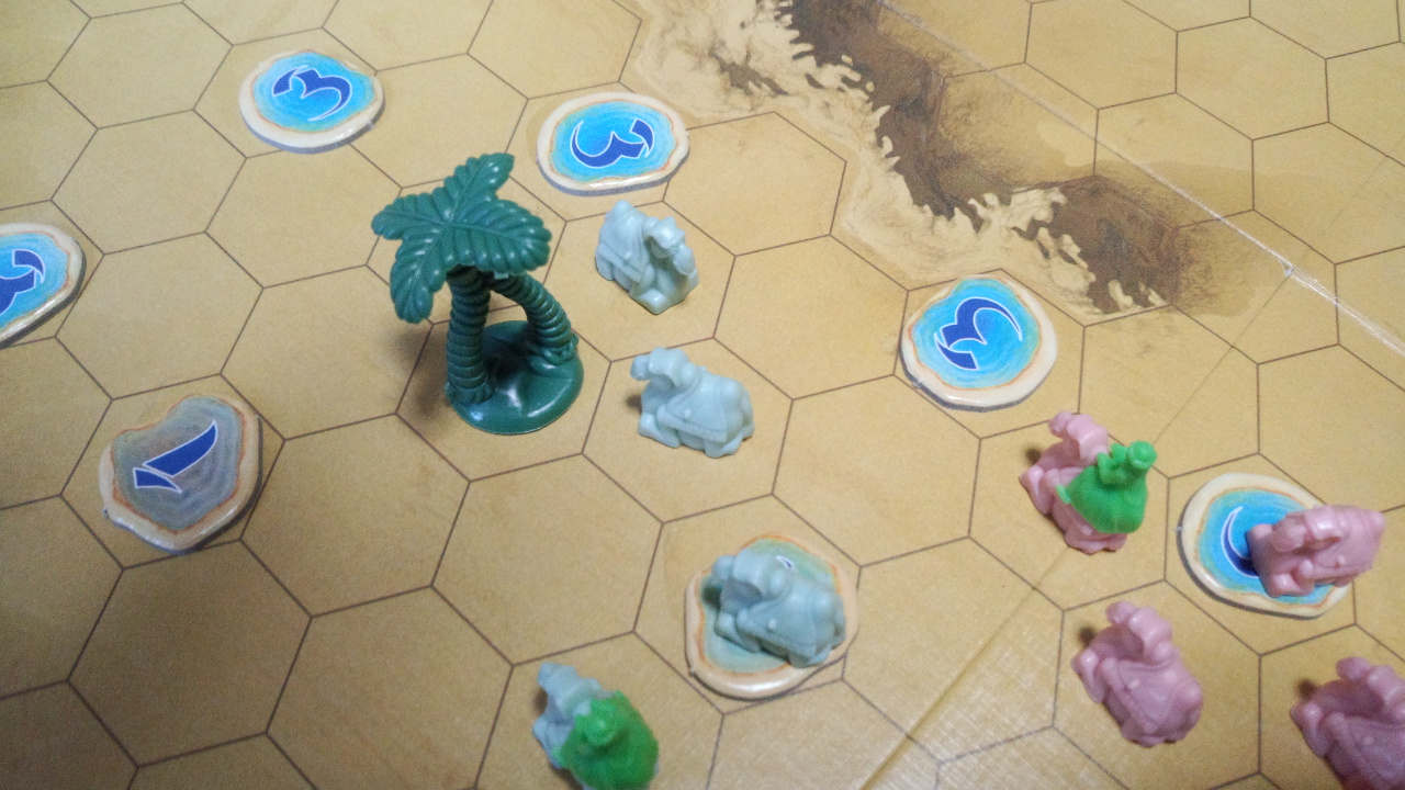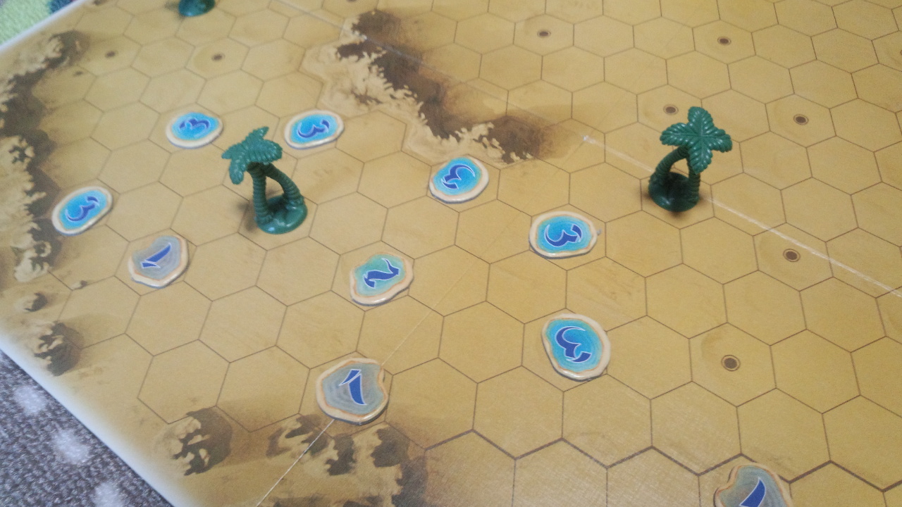 それから、「井戸」タイルをドットのあるヘクスに適当に置く。あと、さっきヤシの木を立てられなかったところにも置いておく。