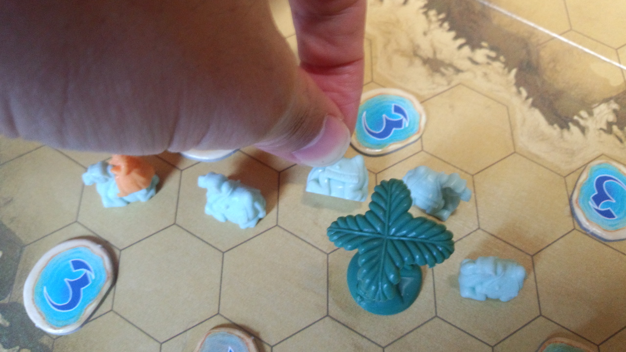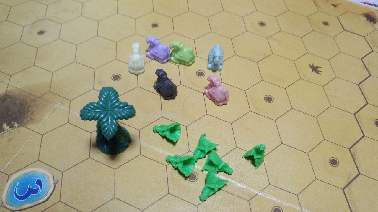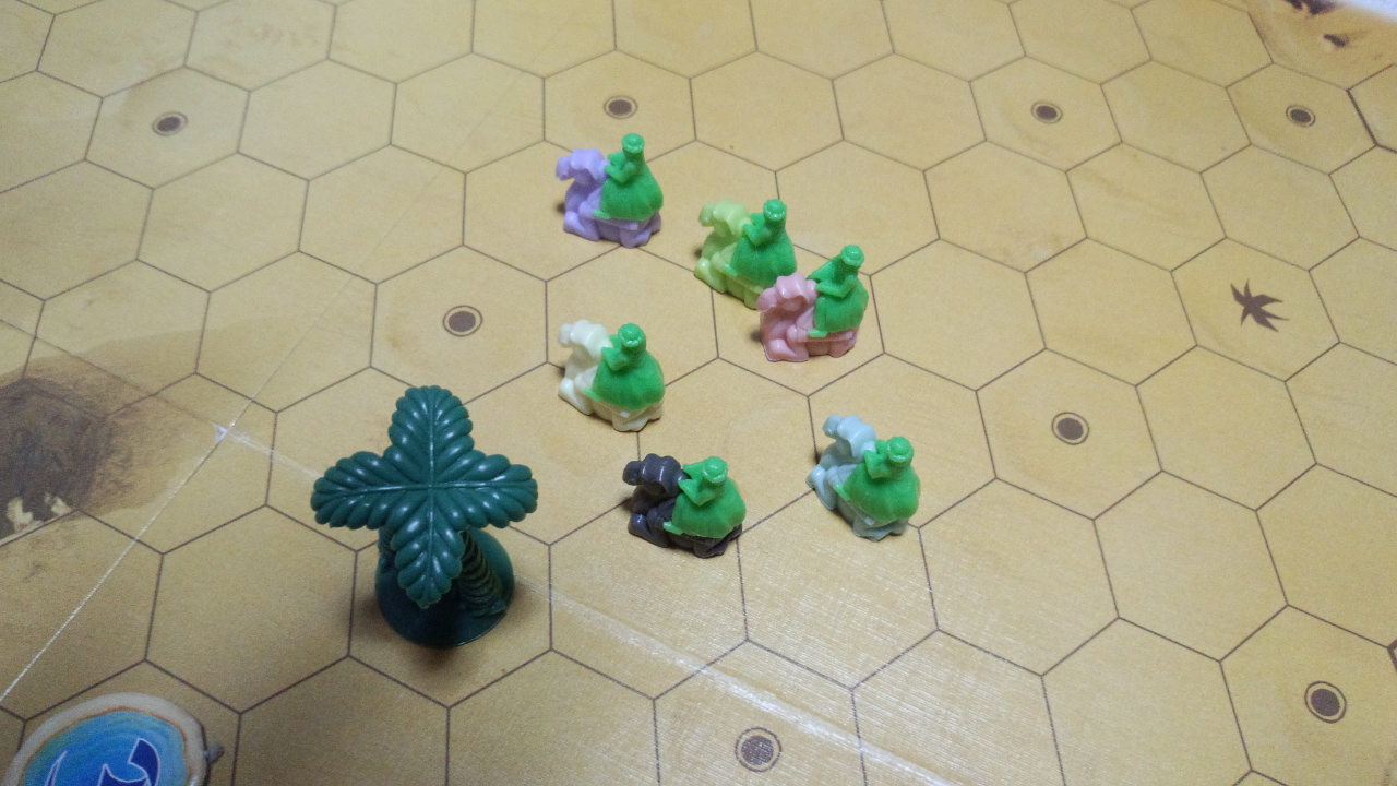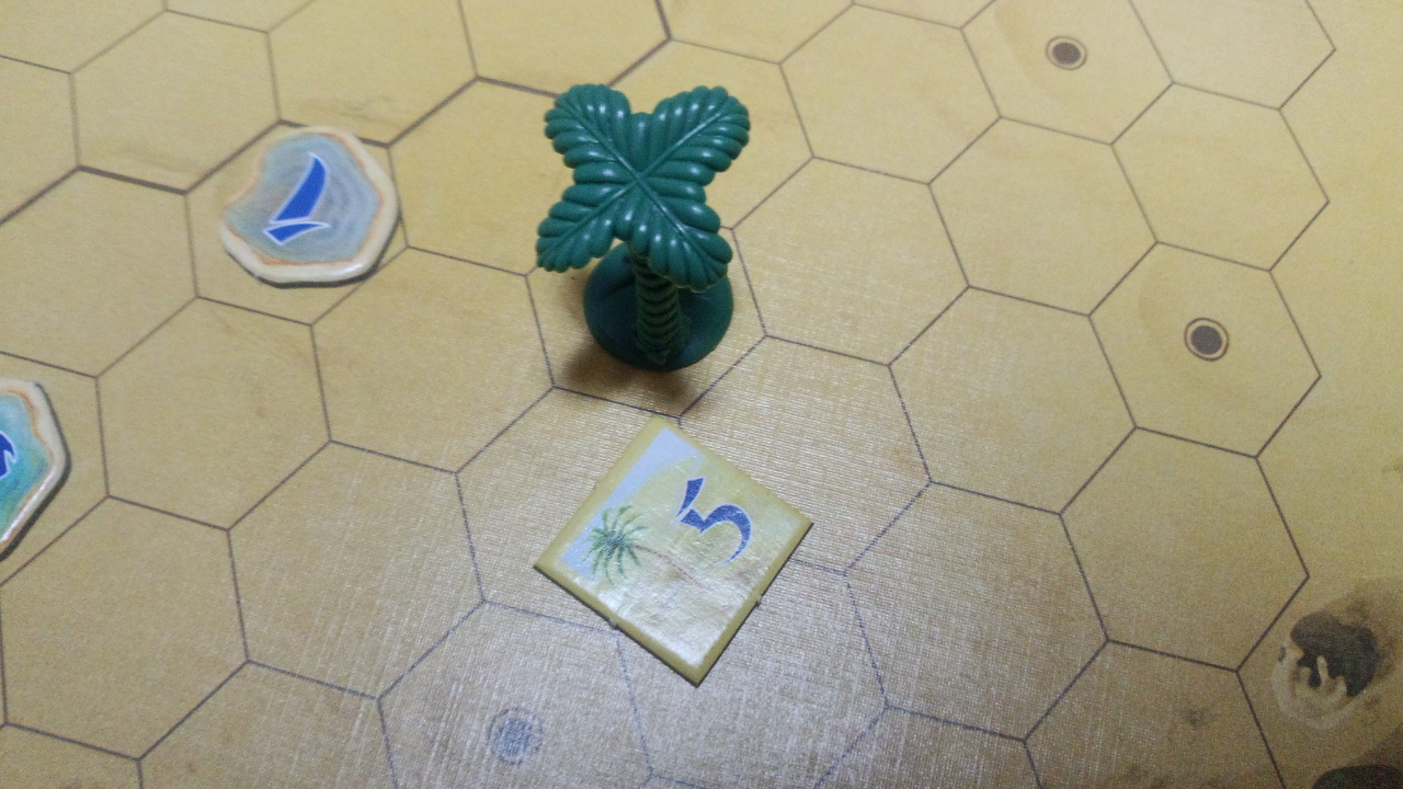 まずやしの木をマークのあるヘクスに立てる。ヤシの木は5つしかないので、マークの数ぶん立てられない。なので適当に選択して建てる。
