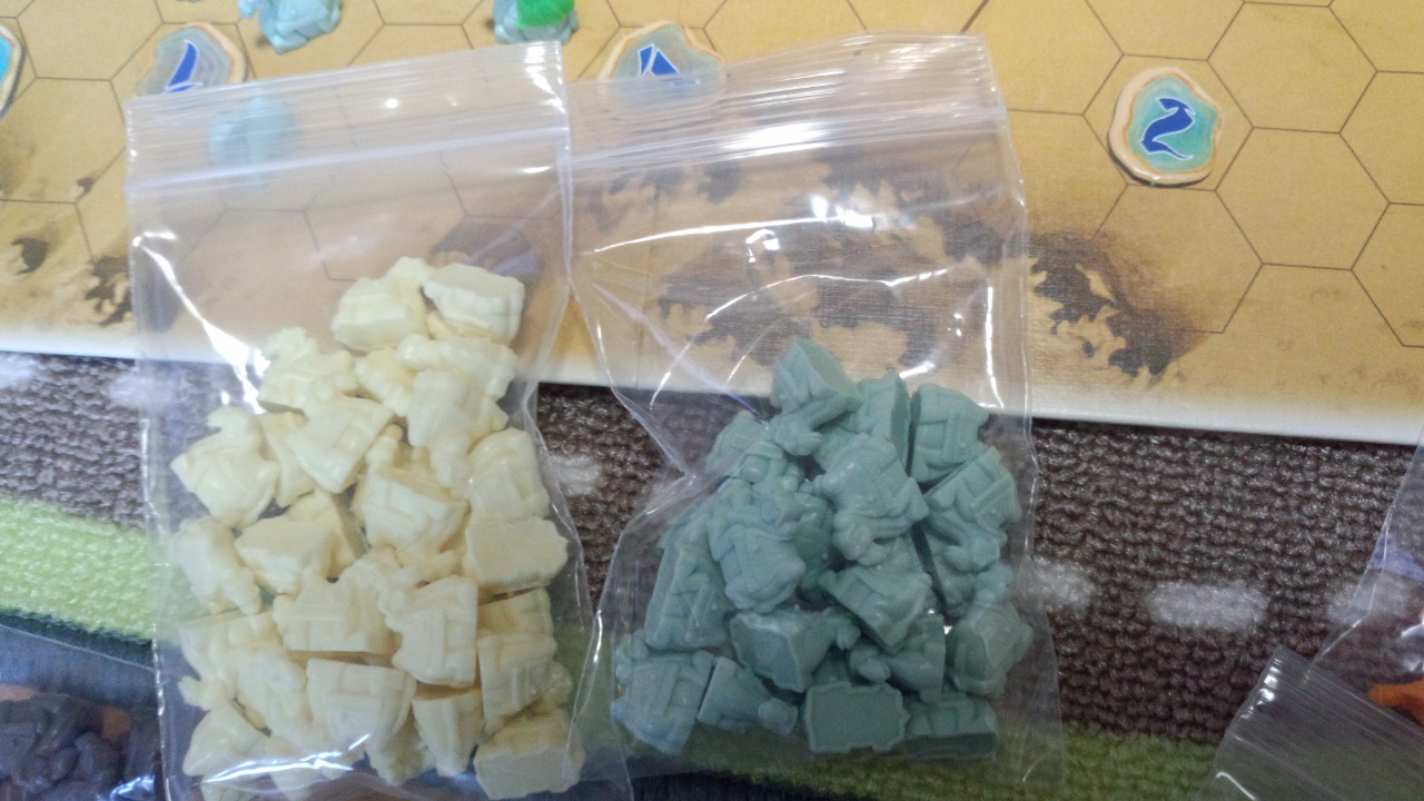 魚はそのまま食べられますが、小麦や牛は加工(チットを裏返す)しなくては食べられません。これには建物効果を使います。屠殺場とか、パン焼き窯とかね。また、魚も燻製にすることで、2食料分の価値を持ちます。