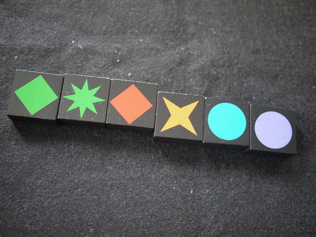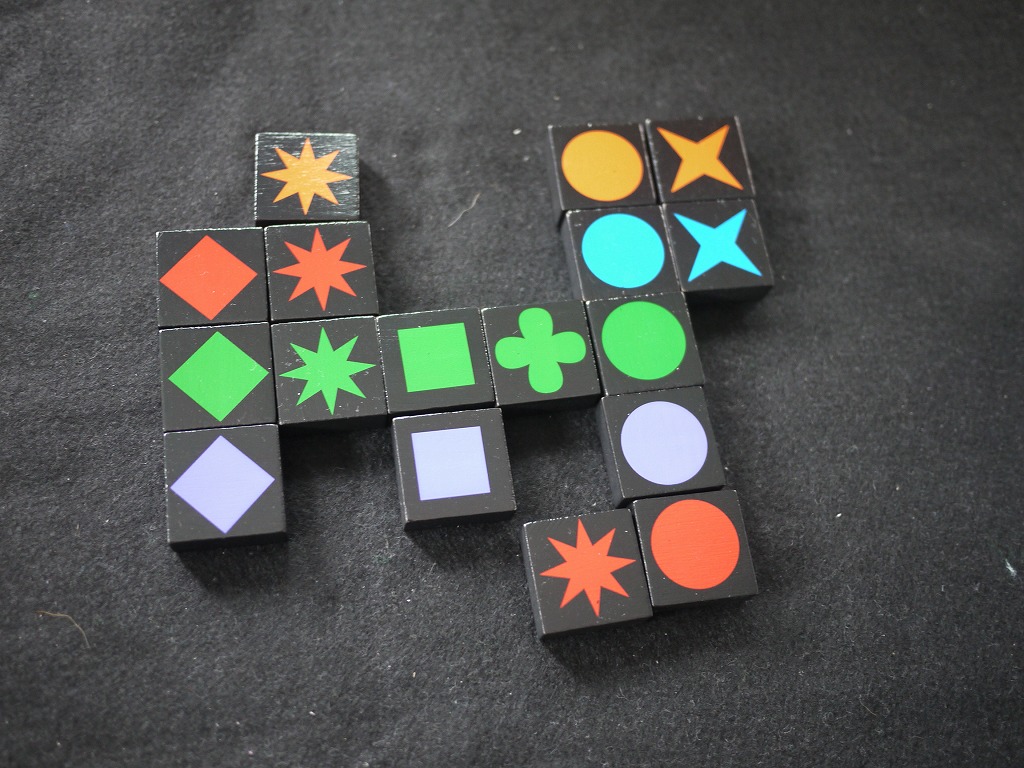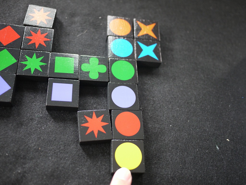 ・6枚の手持ちタイルから場に1枚以上出す。(色が同じか、形が同じなら同時にたくさん出せる)