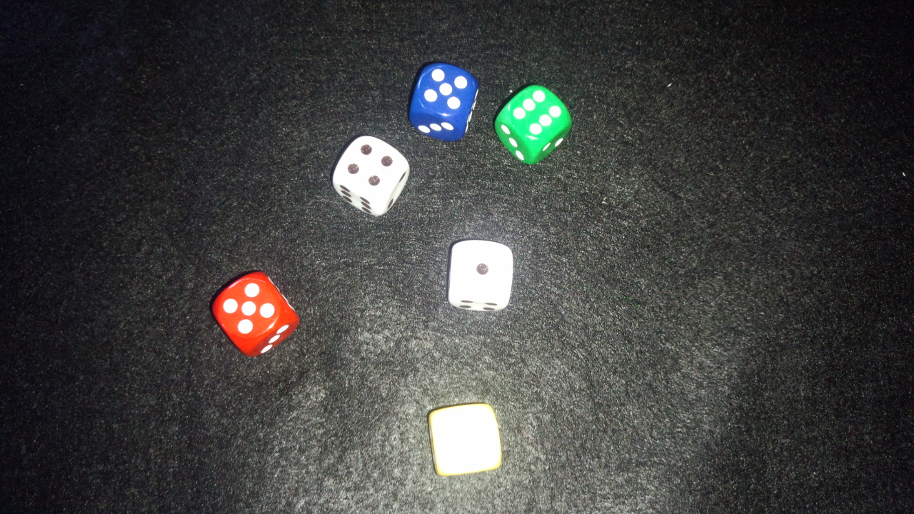 こうしてゲームを進め、ダイスが2個とりのぞかれるか、誰かがパスを4回したらゲーム終了。得点計算です。