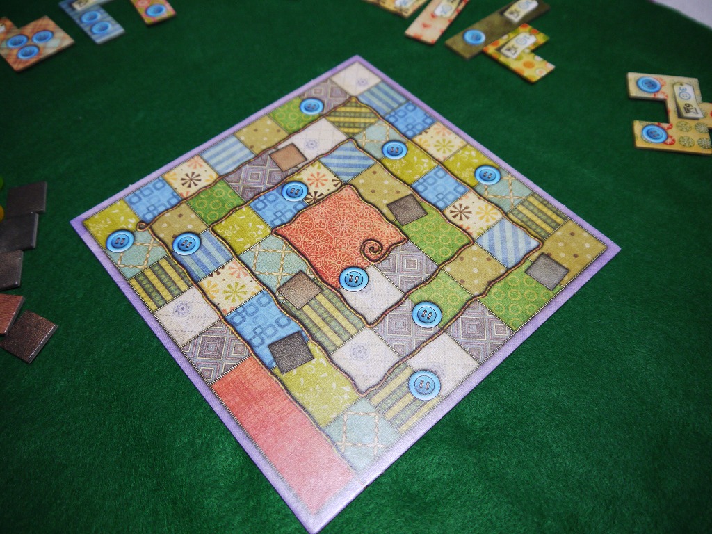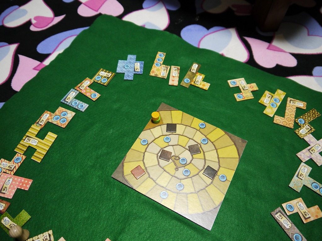 二人のコマをスタート地点におき、パッチワークタイルをぐるっとボードの回りに配置したら準備完了。かなり広い場所が必要になるので注意。二人用ゲームではアルルの丘に次ぐゲームスペース。