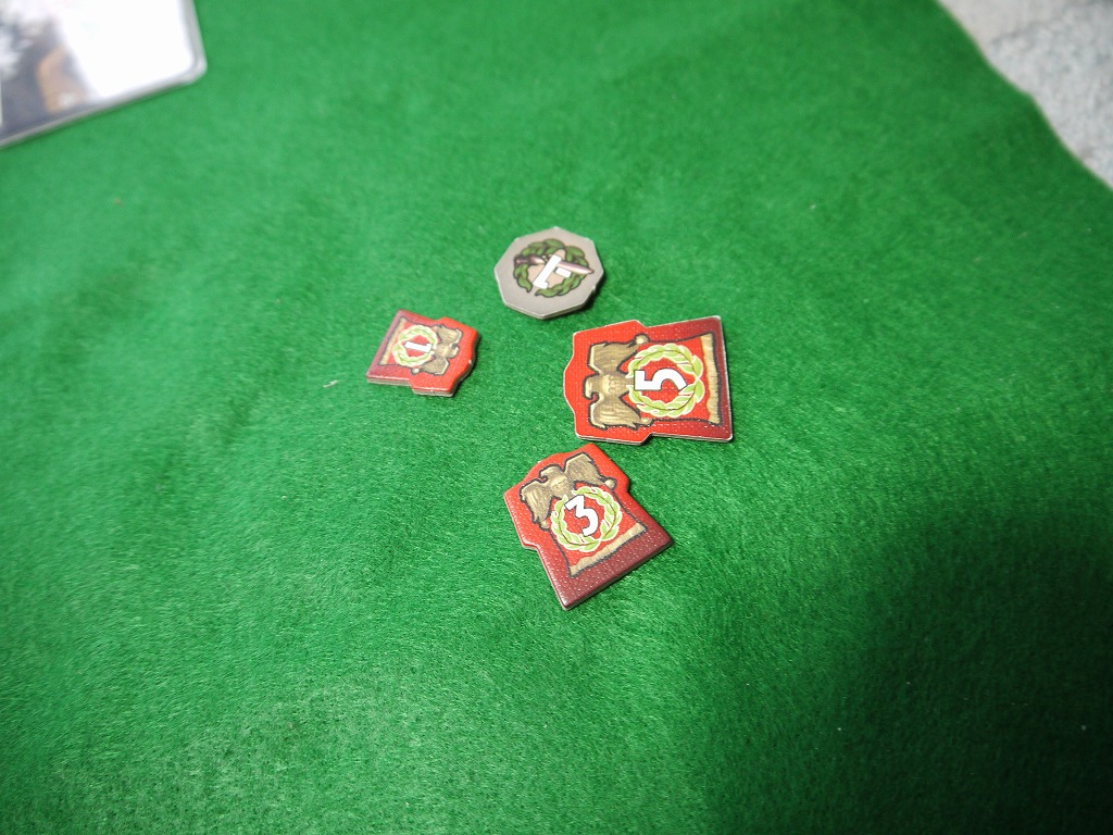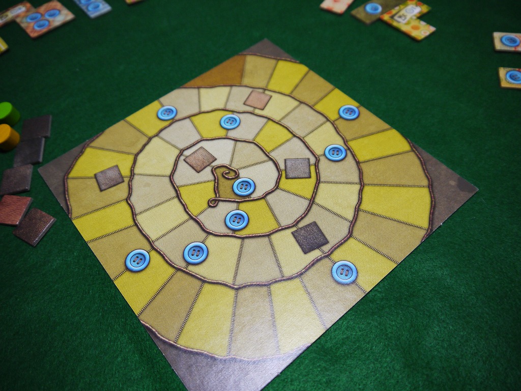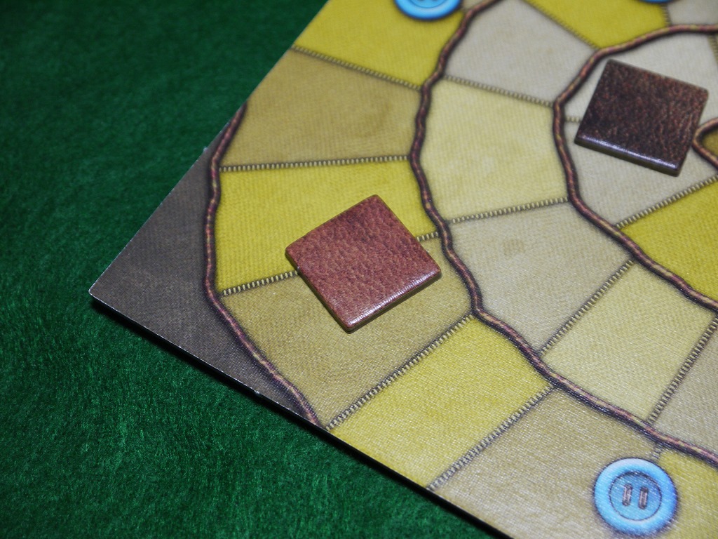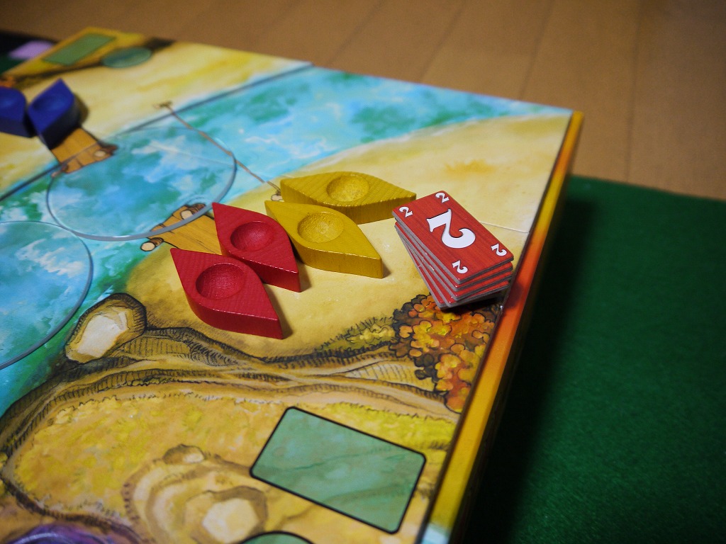 あ、あとこのポーンを一番小さい「2マス」のタイルの左隣に置いておく。各自5ボタン(5金)を持ってゲームスタート。