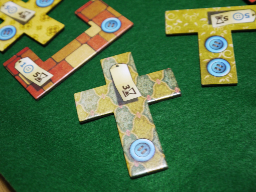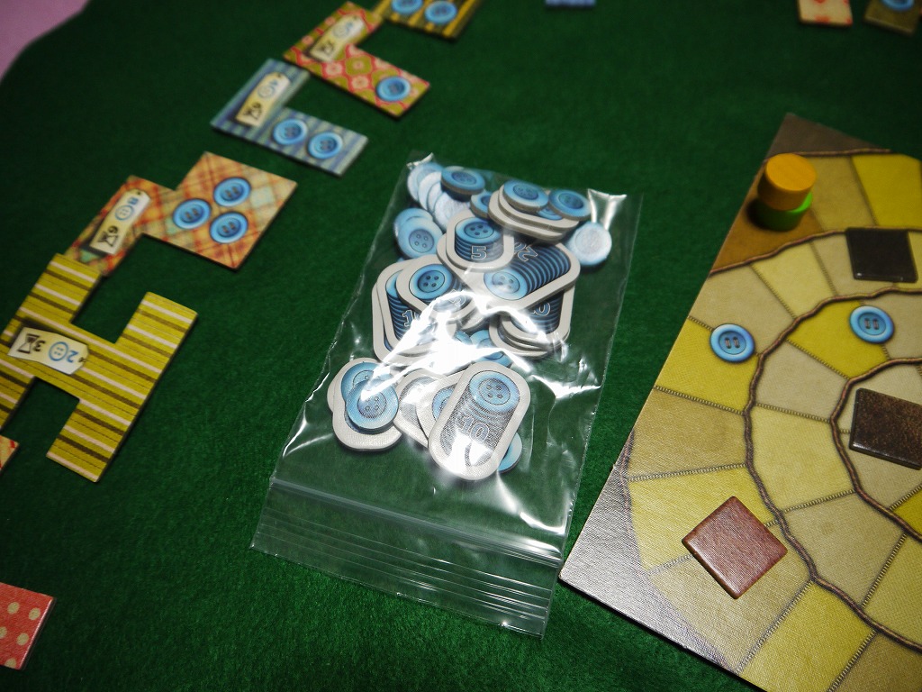 もし時間を進めた結果、コマが「描かれたボタン」を追い越したら決算。自分のパッチワークボードに置かれたタイルにはボタンが描かれている物があると思うが、その数だけボタンがもらえる。
