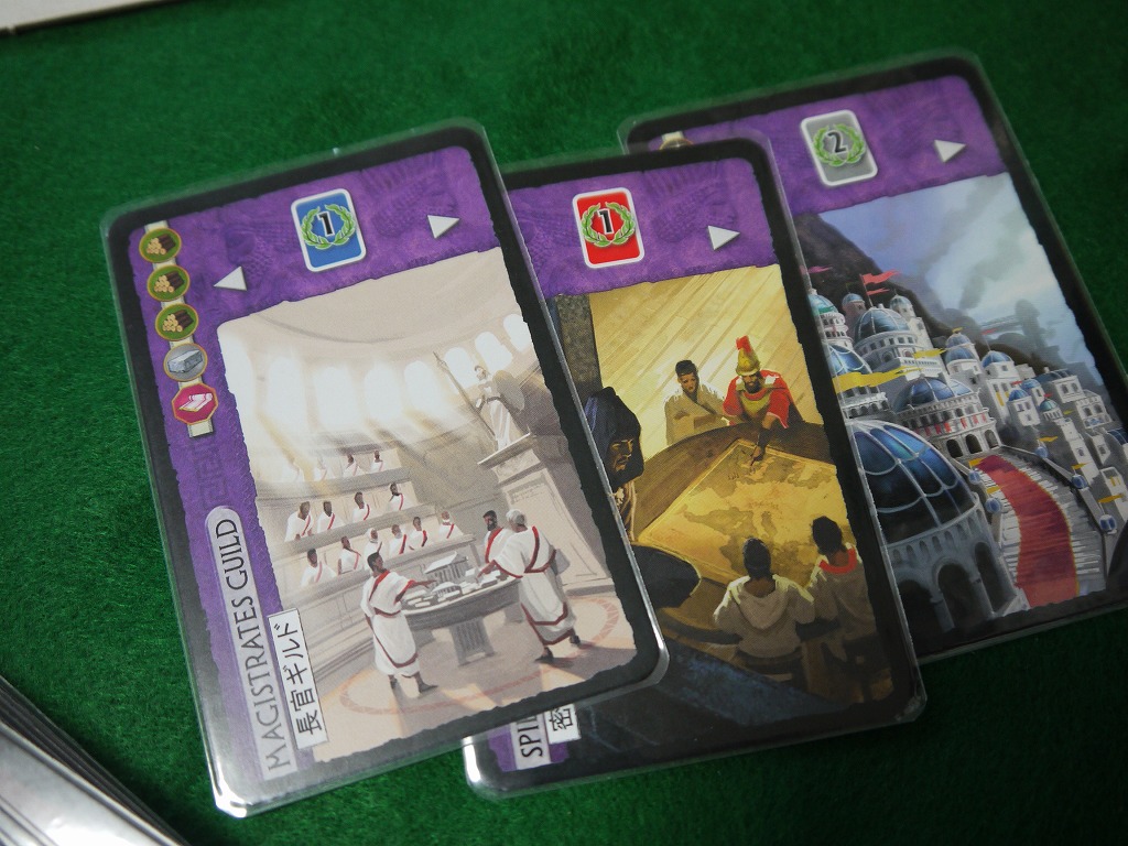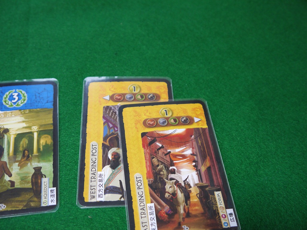 一つの時代が終わる毎に、両隣の文明と武力を比べて戦争する。勝てば勝利点。第一時代は1点、第二時代は3点、第三時代は5点なので、全部勝つと18点だ。逆に負けると-1点トークンを受け取る。