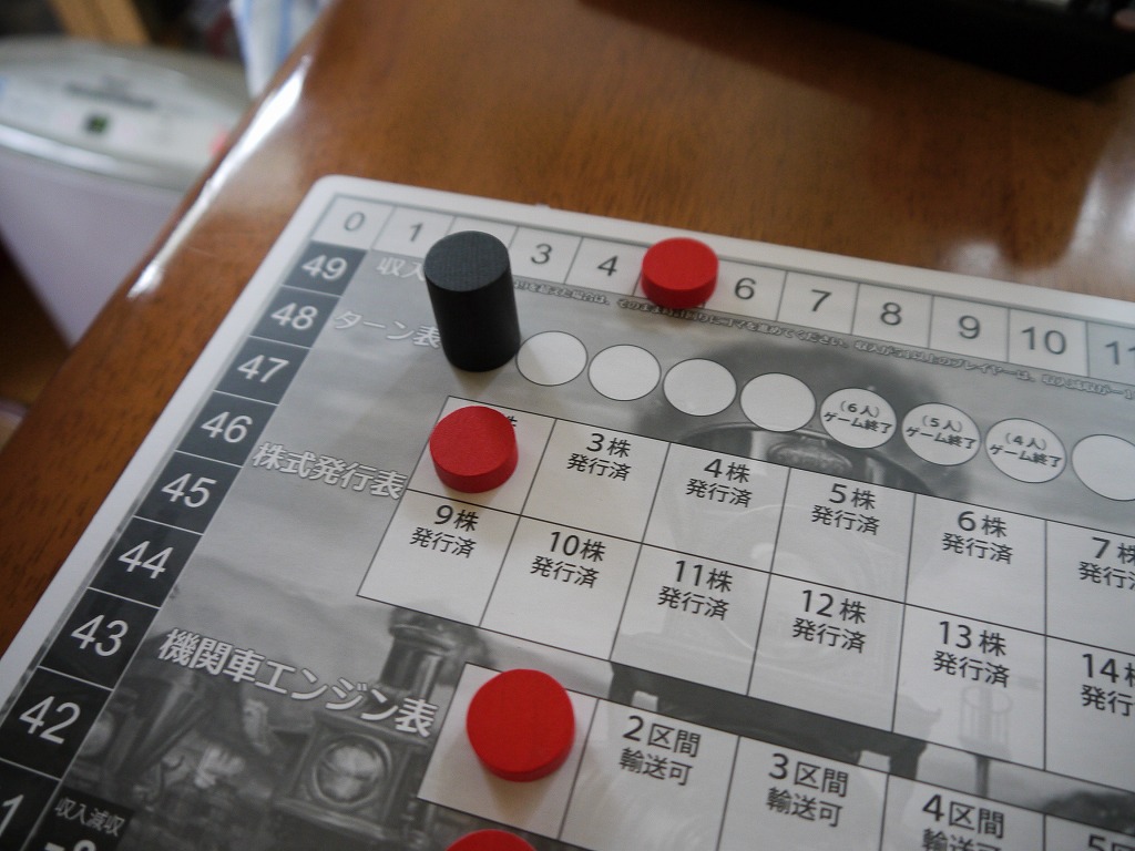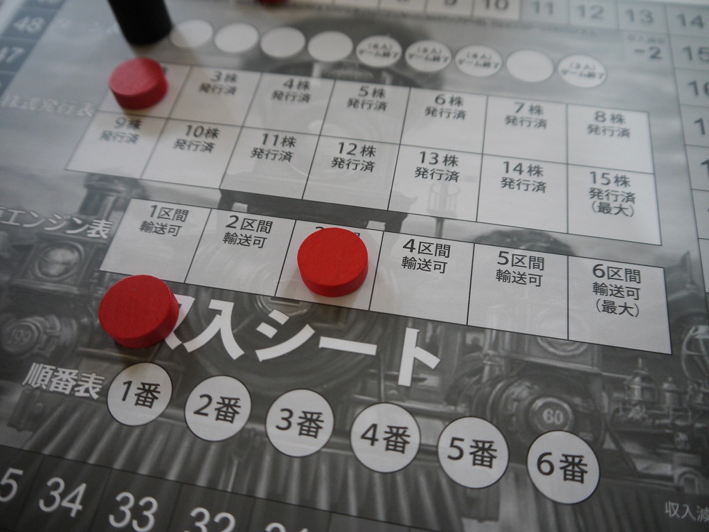 各プレイヤーは任意の数だけ、株式を発行できる。上限は15株で、1株発行につき5金が手に入る。ただし発行し過ぎると配当金が増大して支払いが苦しくなるので注意。