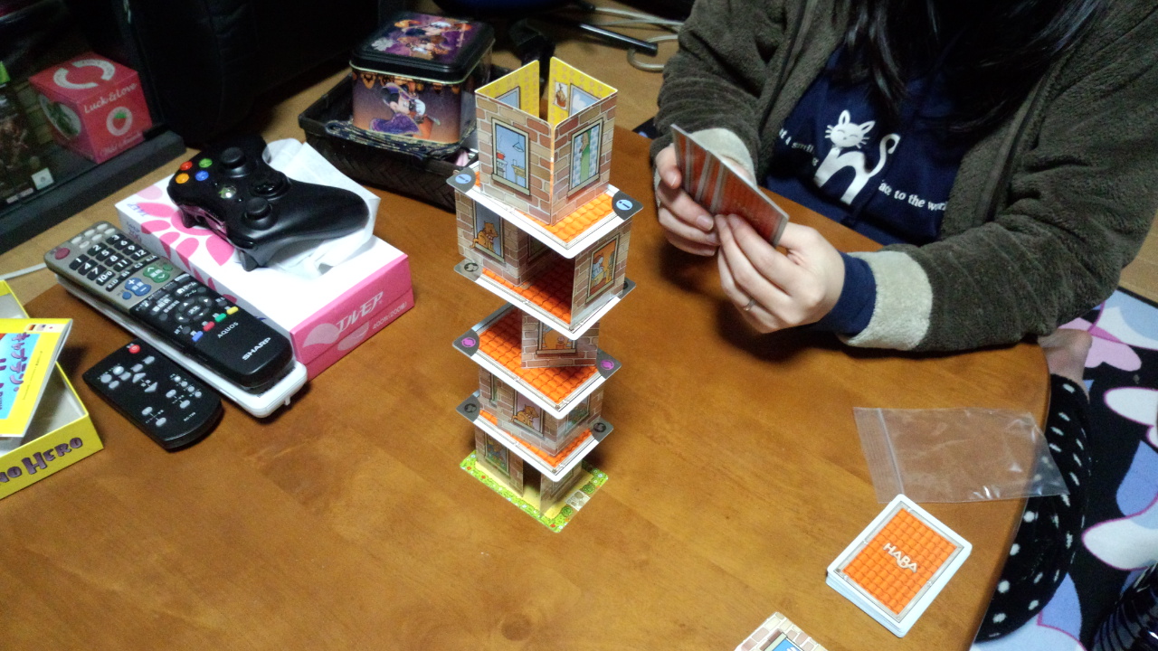 子供向けゲームなのですが、一番下の壁カードを1枚にするという上級ルールがあり、こちらで遊ぶと大人も結構楽しめます。2人でも面白さは変わりません。