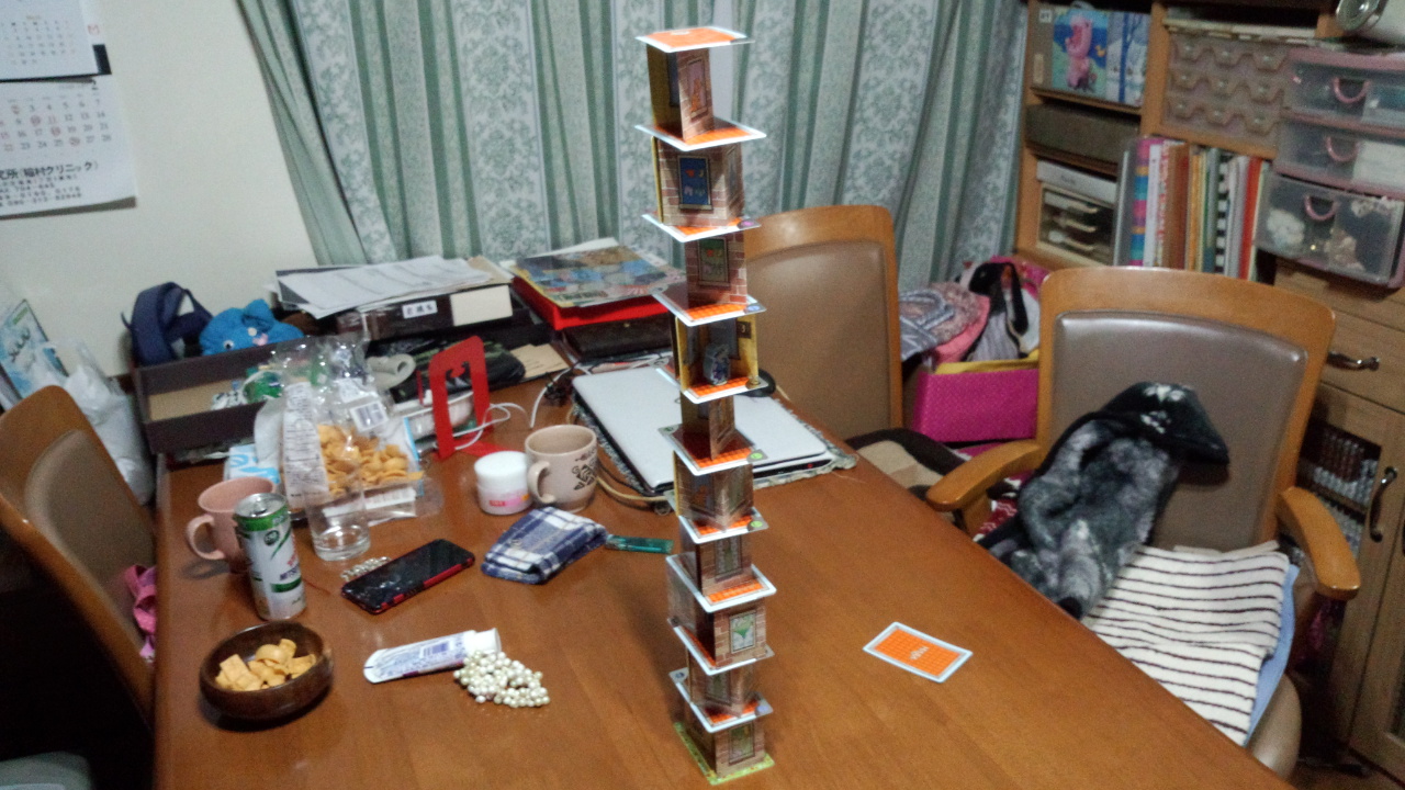 誰かが屋根カードを使い切るか、崩してしまったら手札が一番少ない人が勝ち。