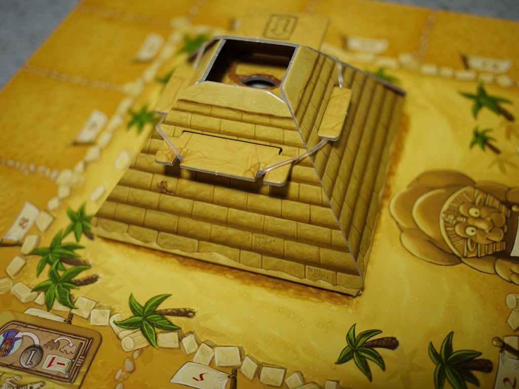 どのらくだが進むのかランダムにするため、このゲームにはスーパーサイコロ振りマシーンであるところのピラミッドが付いている。このピラミッドにサイコロを入れ、逆さにするとランダムで5色のサイコロのうち1つが出てくるというわけだ。