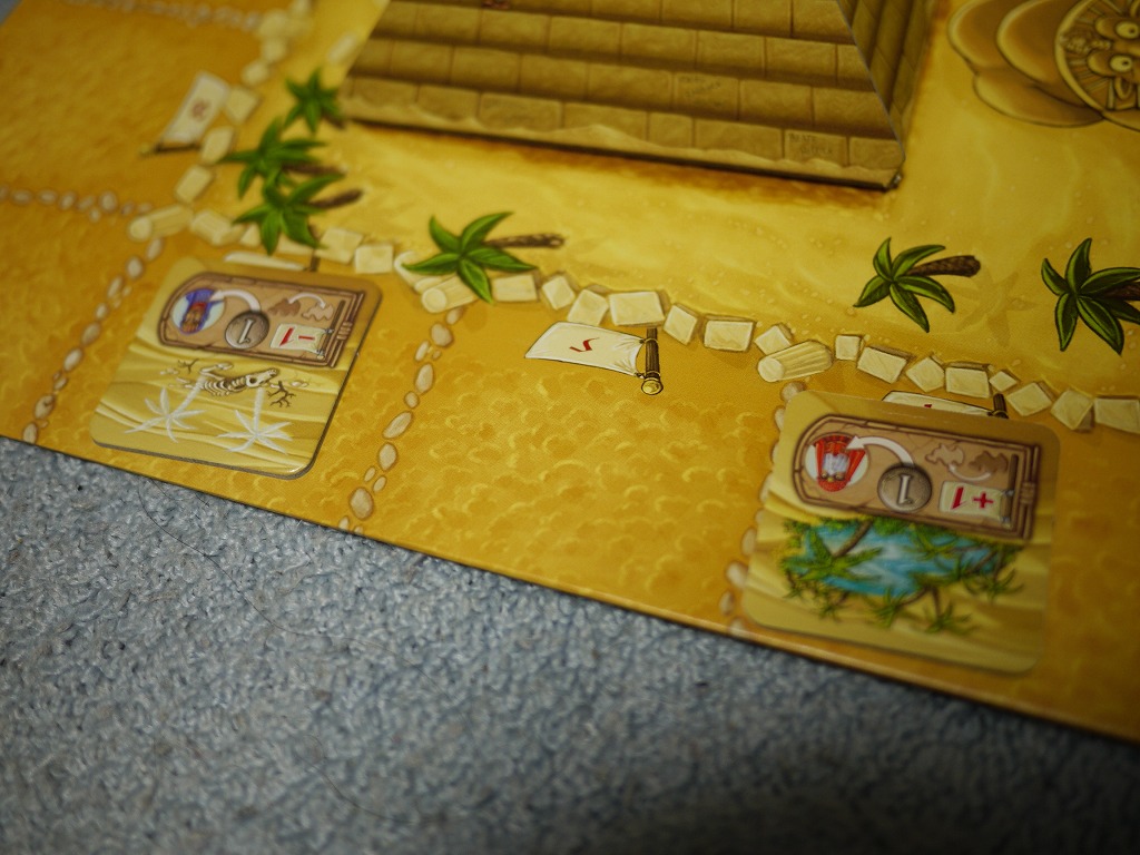 ・オアシスタイルをコースに置く。タイルはオモテウラで効果が違い、表は踏んだらくだが1マス前に進む。裏は1マス戻る。また、自分のタイルが踏まれると一回につき1金もらえる。