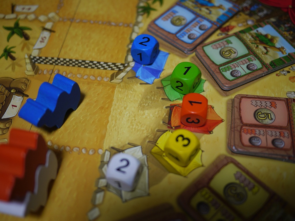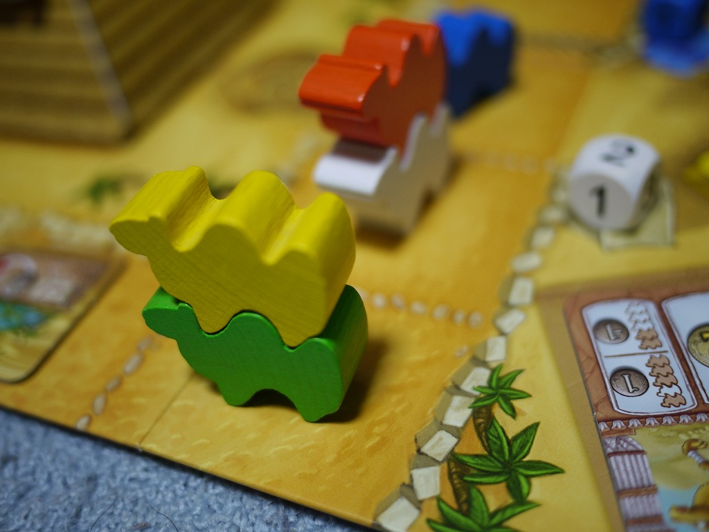 見ての通り、らくだは同じマスに止まると上に乗る。そして下のらくだが進むときは一緒に上のらくだも動く。これがレース結果をわかりづらくするのだ。